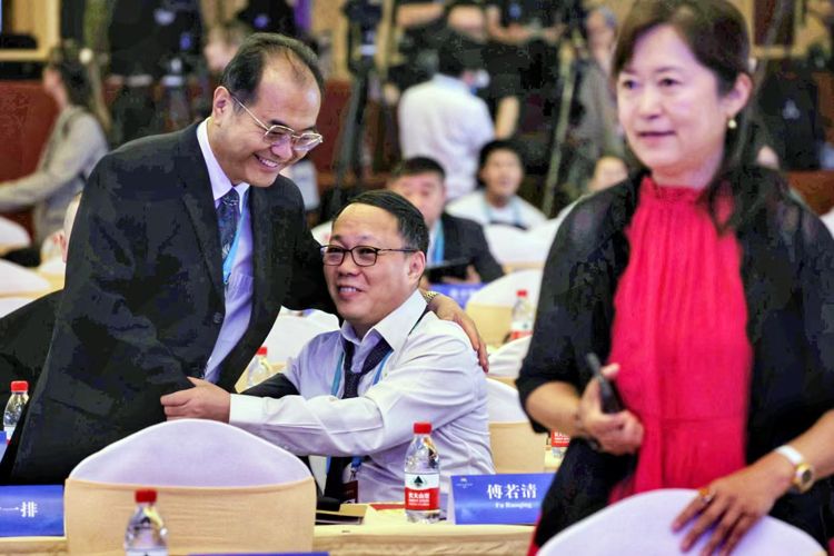 中国电影集团公司党委书记、董事长傅若清(右)与友人打招呼。