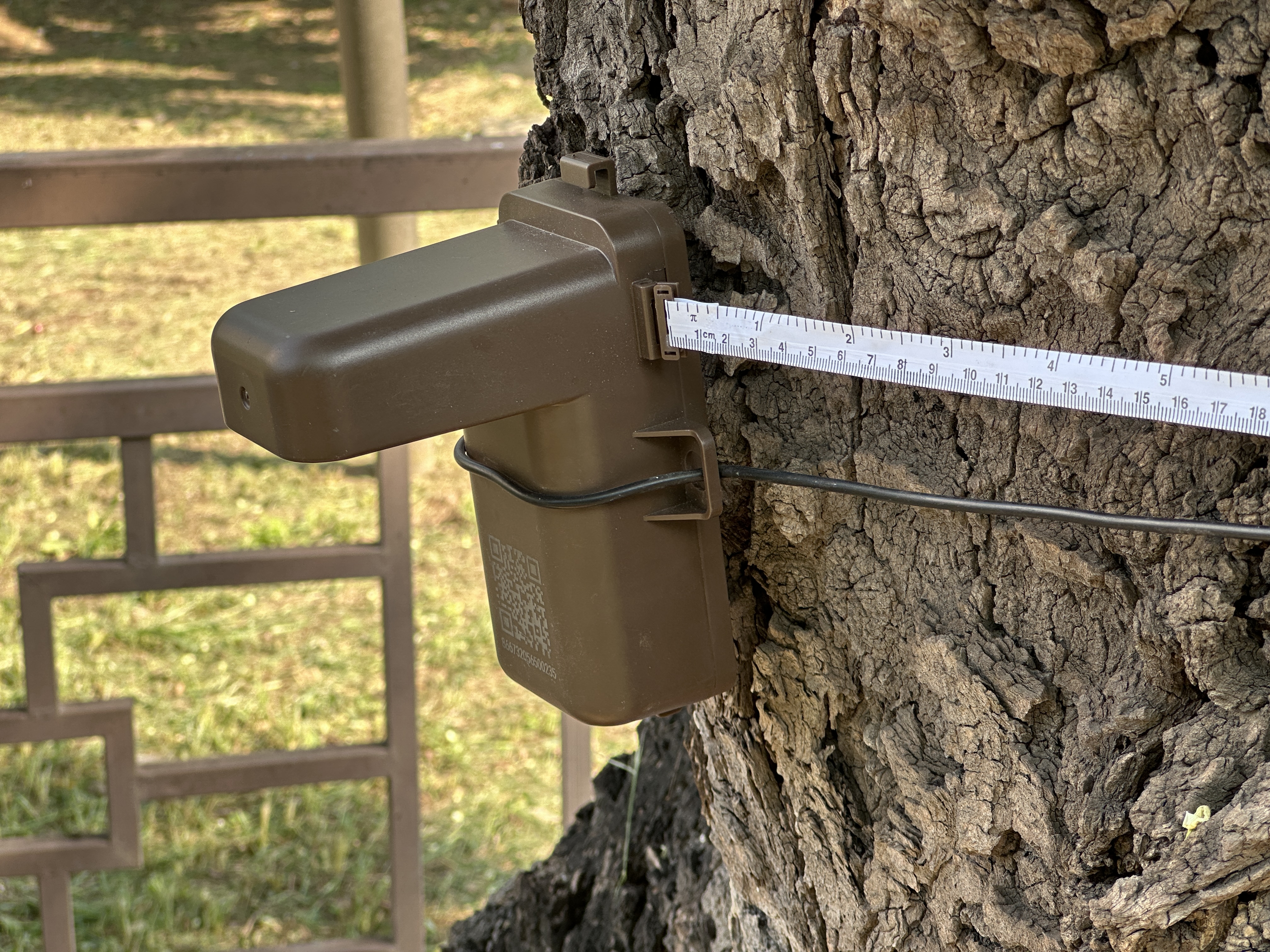 记者在树干上还看到一个方形的小盒子,上面系着一圈标尺,通过标尺便可直观地观察到树干胸径,这是判断古树生长状况的依据。值得一提的是,小盒子里装有芯片,一旦古树出现振动等异常情况,该装置将立刻报警,工作人员的手机上会收到报警信号。