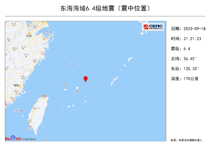 新京报讯 9月18日21时21分在东海海域发生6.4级地震,震源深度170公里,震中位于北纬26.45度,东经125.35度,距海岸线最近约0公里。