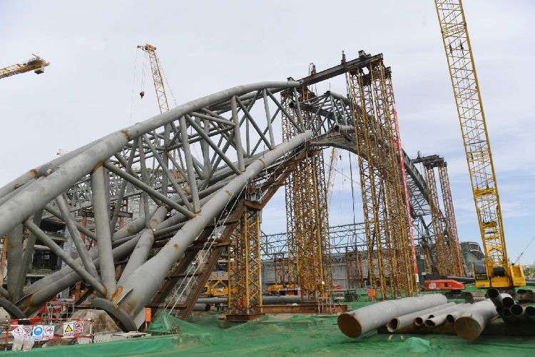 9月19日,新国展二期项目施工现场,正在合拢的拱门巨型桁架。北京建工集团新国展二期项目经理徐德林向新京报记者介绍,“我们连续攻克巨型箱型组合梁、序厅桁架、索幕墙桁架等多项施工技术难题。拱门巨型桁架区是整个项目最后一块难啃的硬骨头,也是完成钢结构封顶的最后一块‘拼图’。”