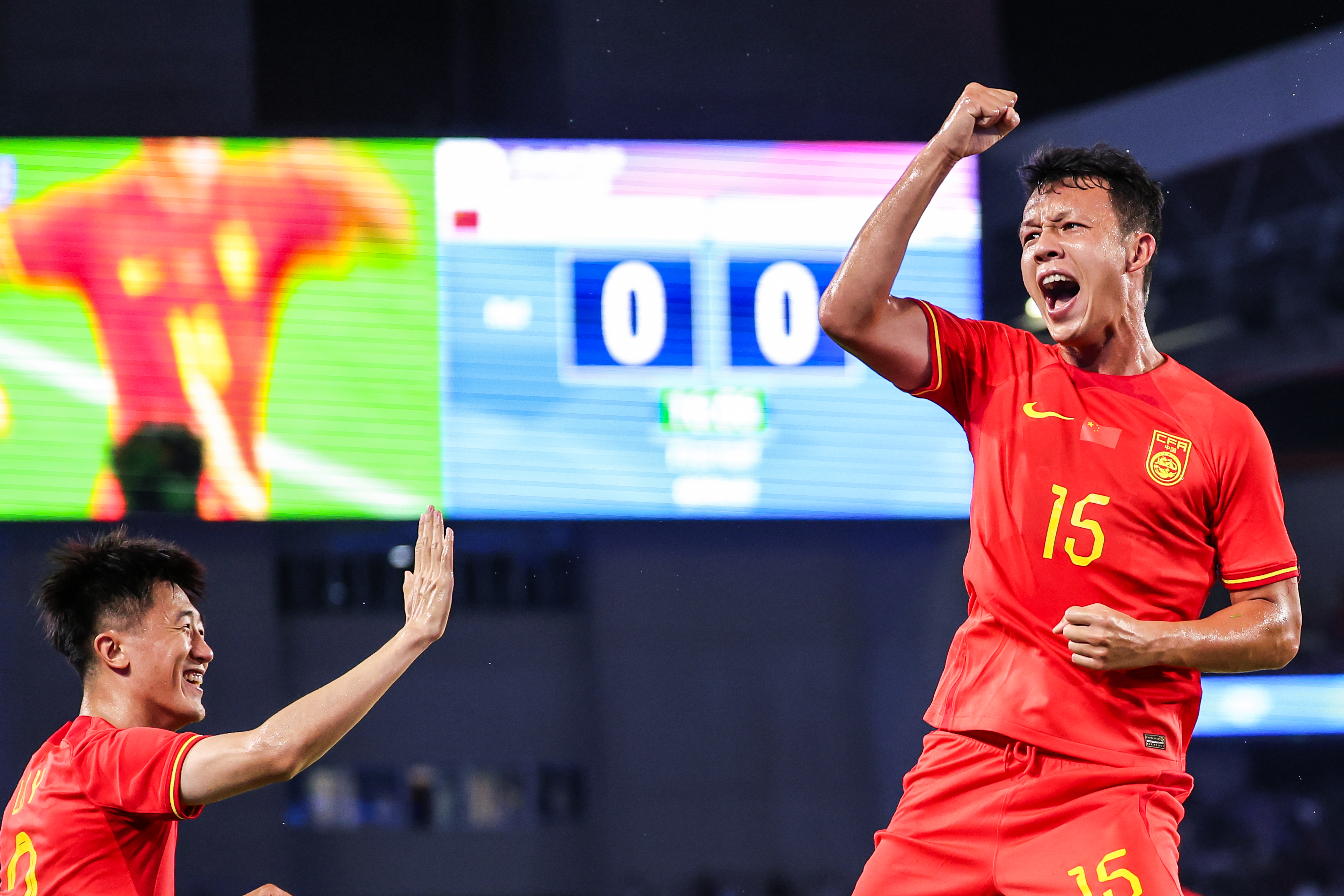 9月19日晚,亚运会男足小组赛,中国队旗开得胜,高天意(右)庆祝进球。 杭州亚运会供图