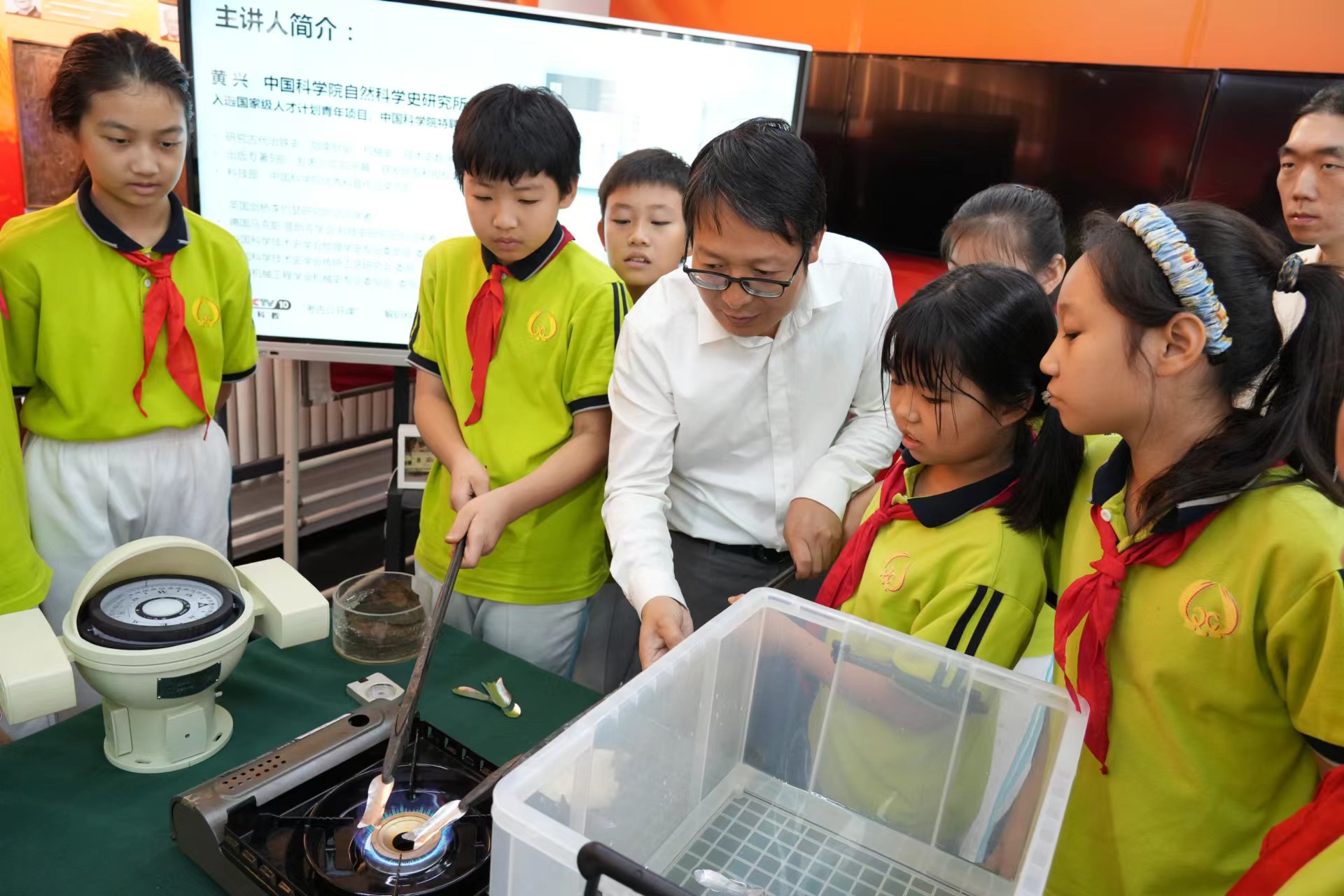 黄兴以自己近年来取得的重大科研成果为案例,将科学、历史和实验融合在一起,讲述如何克服困难,解决科研难题;带领孩子们操作磁石勺“司南”指南,体验东汉地磁环境下磁石勺的指向性;按照北宋《武经总要》“鱼法”——这一中国古代独门秘技,利用热剩磁效应制作指南鱼,还让孩子们亲手操作了十余种指南针。