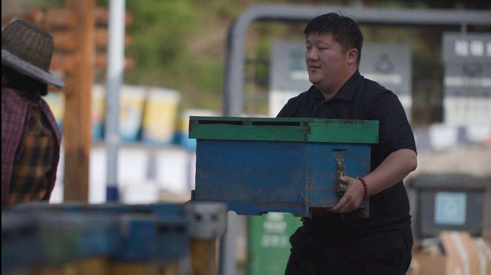 2022年9月,北京密云太师屯镇一处蜂场,王唯伊指导蜂农生产,帮忙搬运蜂箱。受访者供图