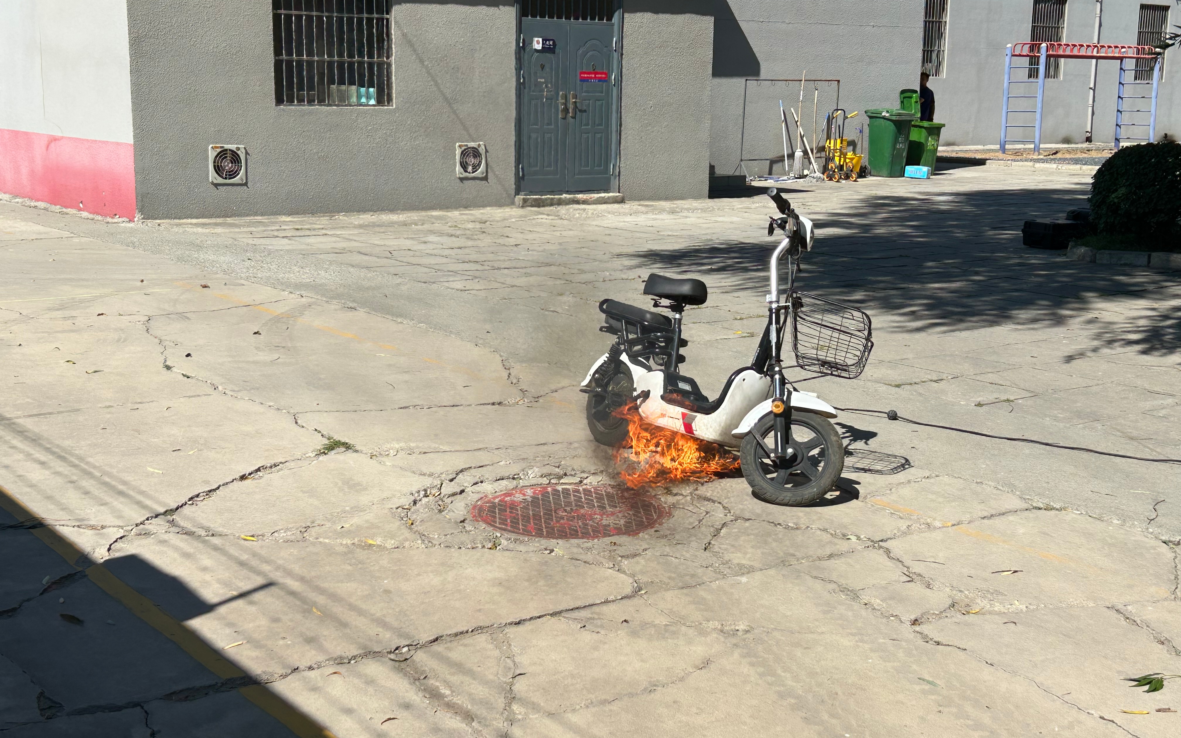 新京报记者在现场看到,第一项试验,现场准备了一辆使用了近三年的电动自行车,消防员对电池外观进行查看,发现其有轻微破损,用万用表检测该电池的电量,显示处于满电状态。消防员用并非原装的大功率充电器对该车进行充电,约一小时左右该车电池处开始冒烟,随后迅速起火并产生大量浓烟。