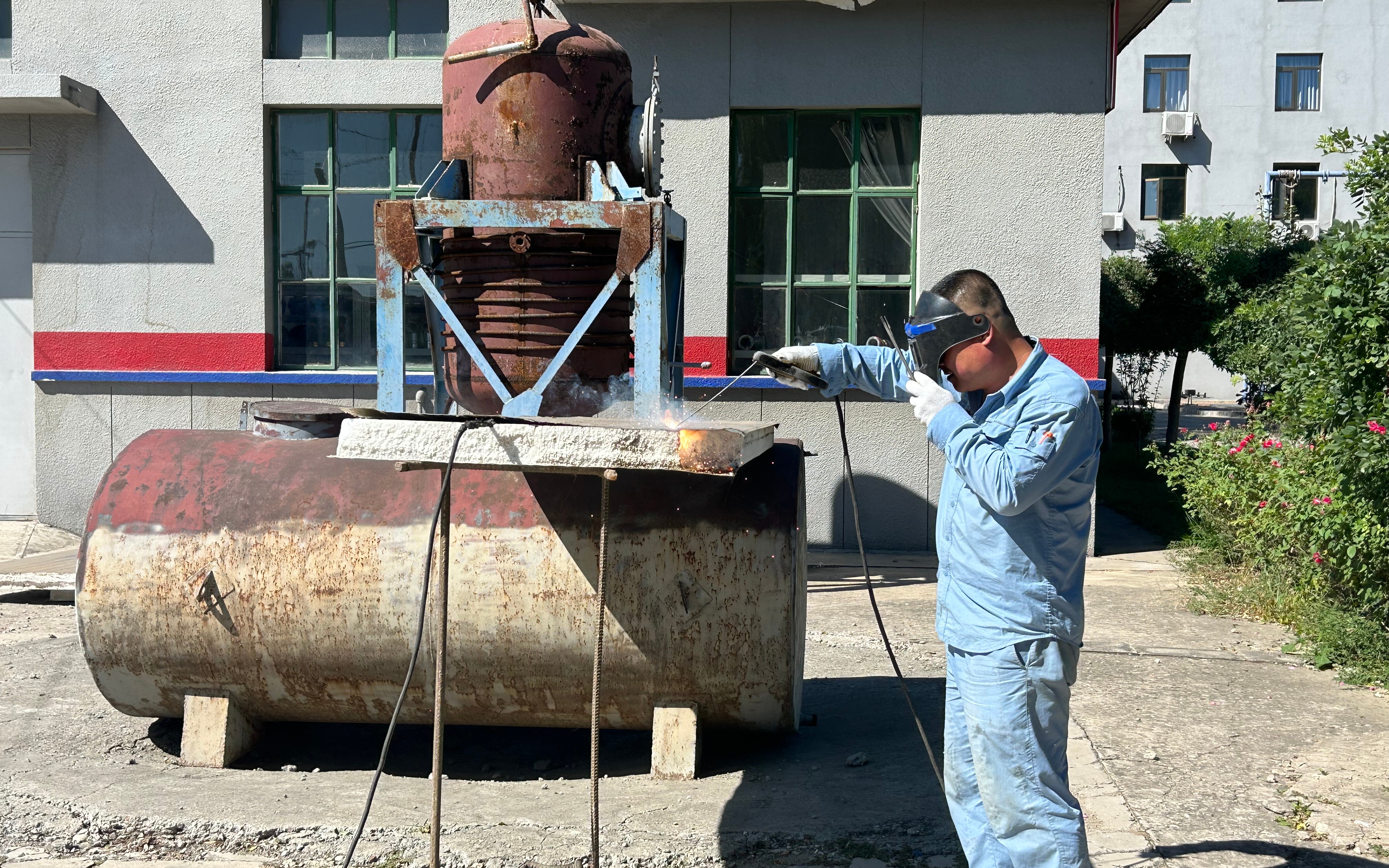 试验人员正在用电焊焊接聚苯彩钢板。新京报记者 彭镜陶 摄