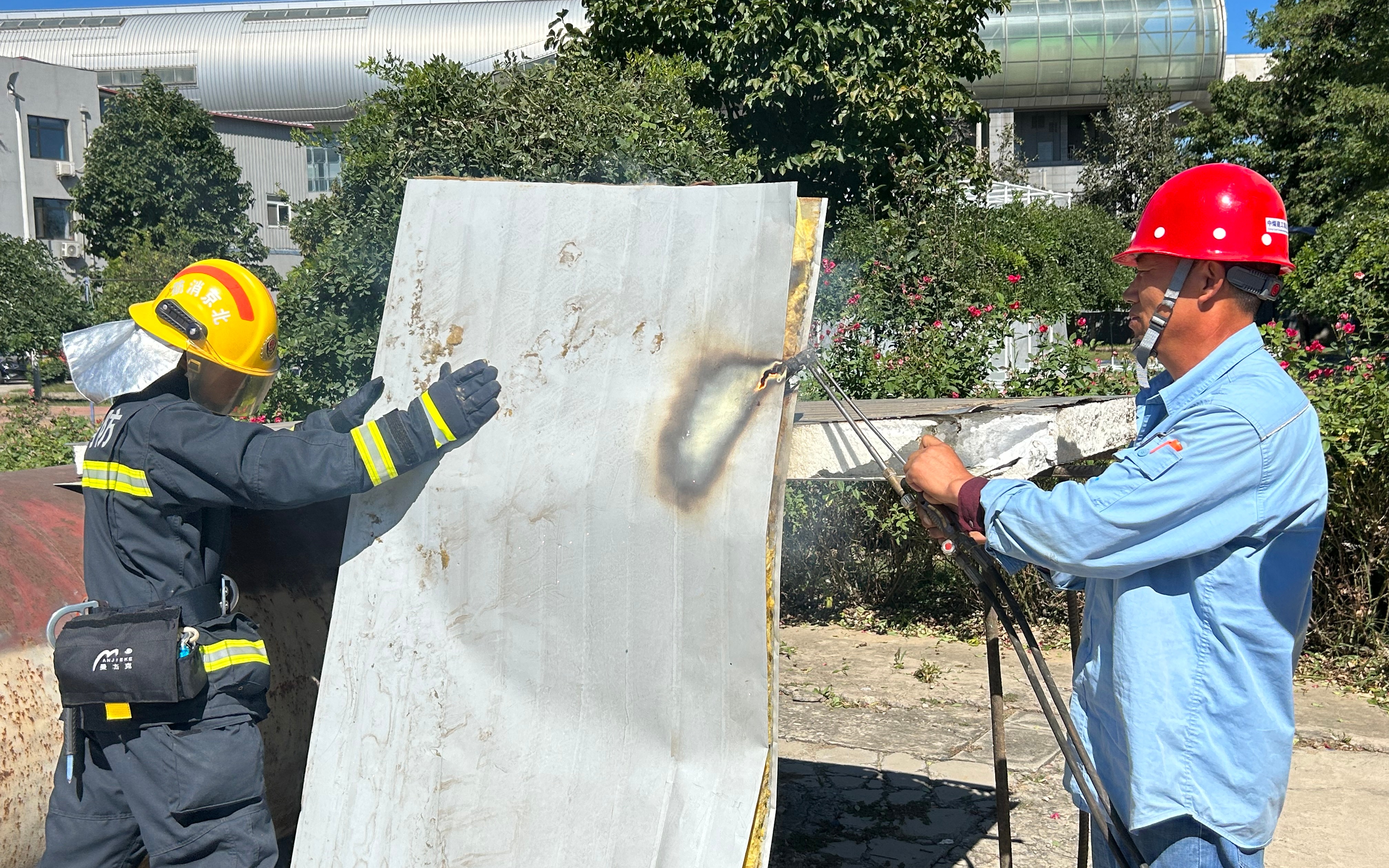试验人员正在用气焊的方法切割岩棉彩钢板。新京报记者 彭镜陶 摄