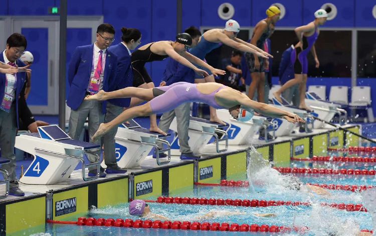 9月24日举行的杭州亚运会游泳比赛中,中国游泳队摘得女子4x100米自由泳接力金牌,包揽开赛首日全部7枚金牌。图为第一棒杨浚瑄入水。