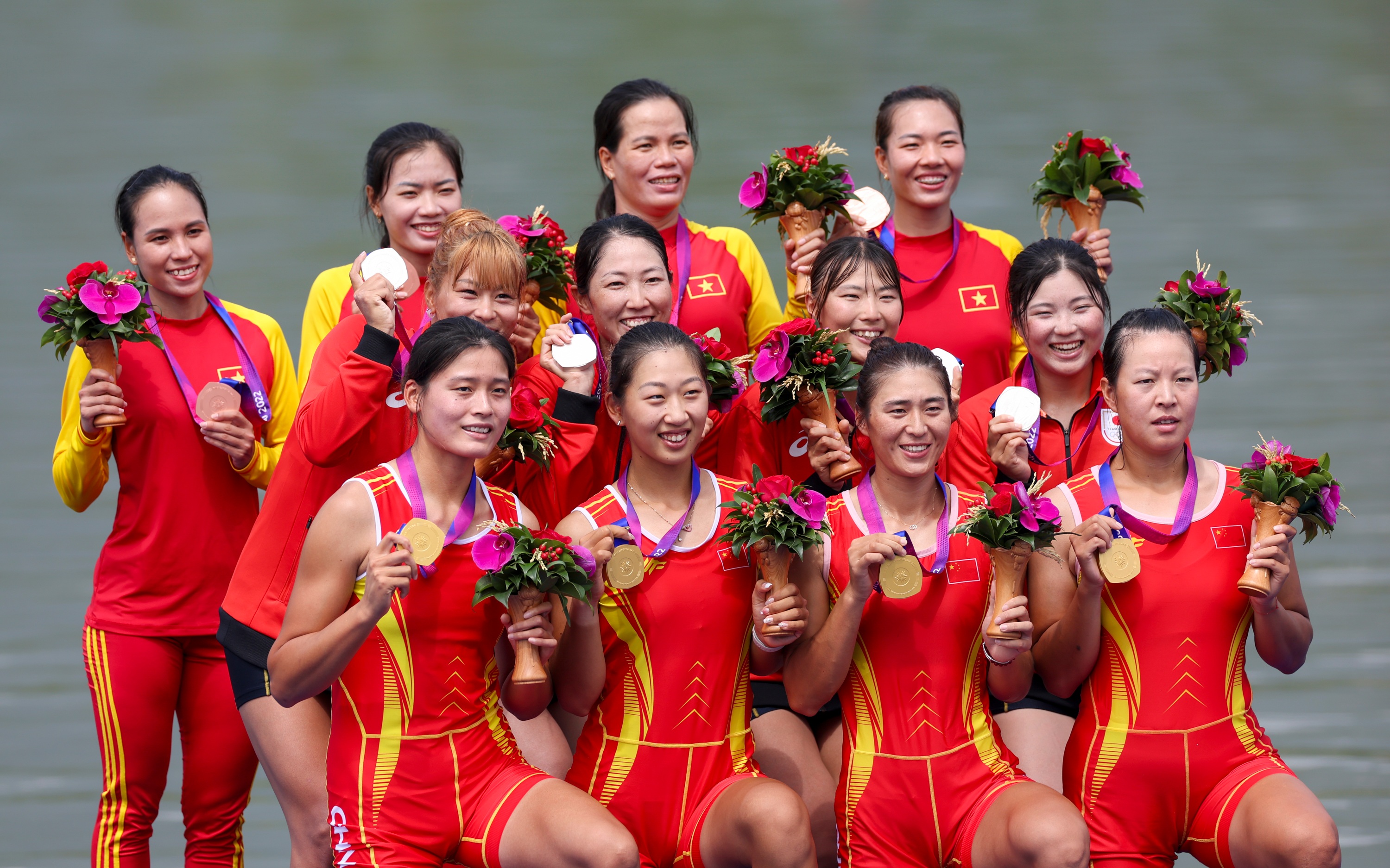 女子四人双桨决赛,由陈云霞、张灵、吕扬、崔晓桐组成的东京奥运会冠军艇轻松夺魁。韩崴、伊绪帝、臧哈、阿迪里江•苏里坦斩获男子四人双桨冠军。张书贤、俞思源、鲍丽郡、董郗娅、张海蓉、刘晓鑫、王子凤、徐星叶、徐霄韩出战的女子八人单桨有舵手优势明显,轻松夺冠——这是中国代表团本届赛事第26枚金牌,也是中国代表团亚运会历史第1500枚金牌。