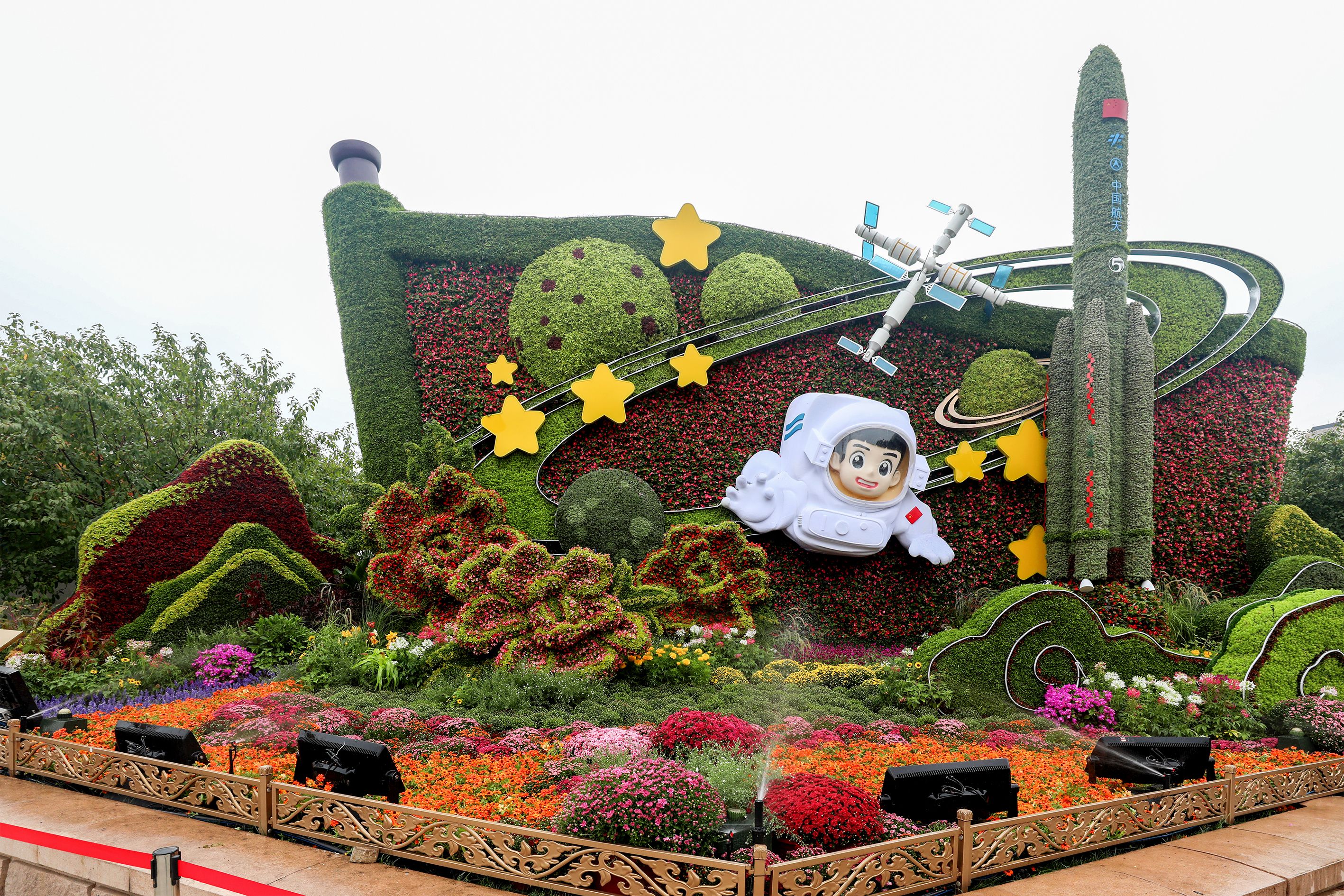 今年广场花篮首次装入象征丰收的五谷元素(水稻、小麦、小米、黄米、大豆),花篮内的花卉等部件均使用阻燃、抗风材料进行3D打印,有效保障安全性、稳定性和观赏性。广场两侧绿地布置5050平方米吉祥如意花带图案,布置花球18个。