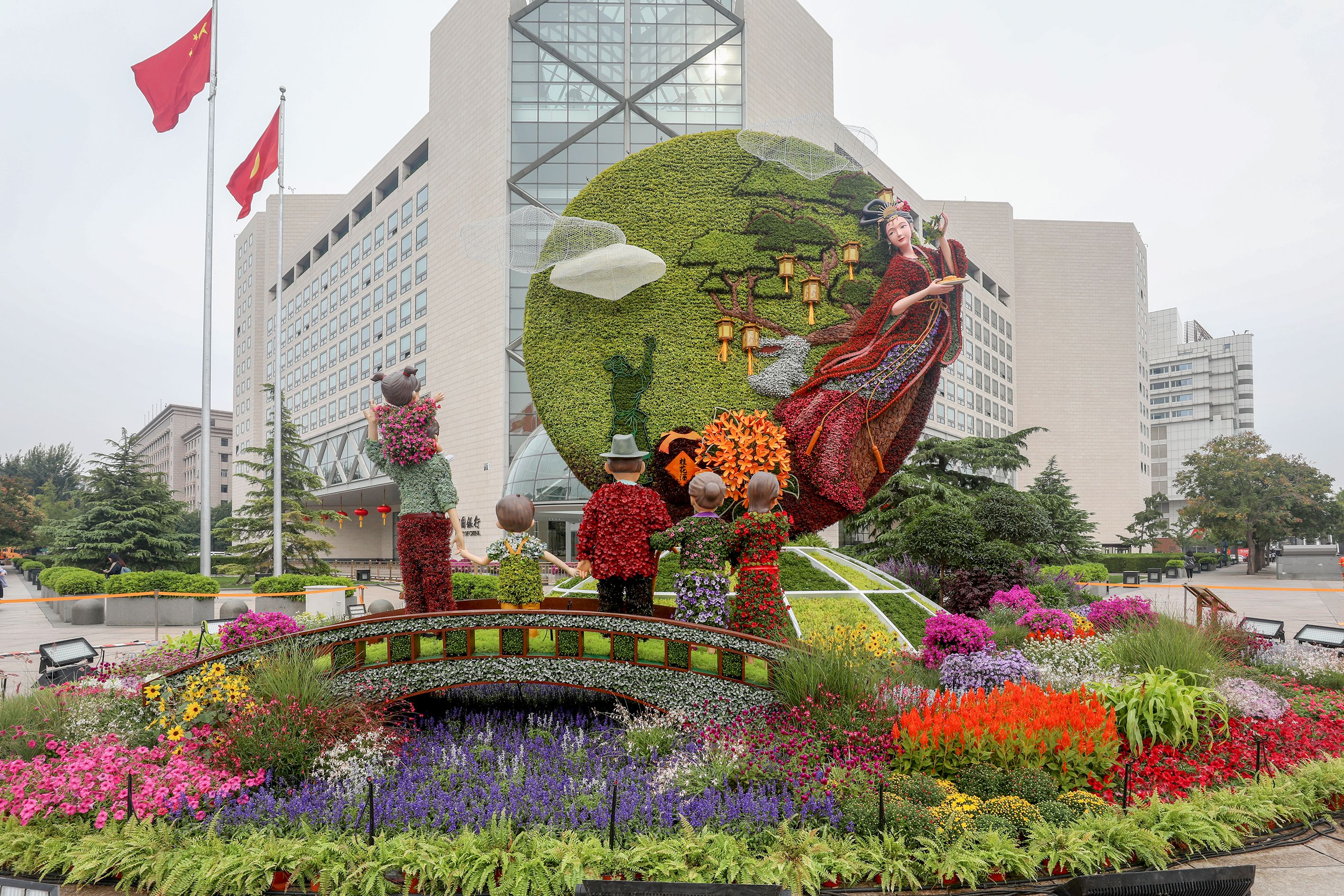 “祝福祖国”巨型花篮正式亮相天安门广场。北京市园林绿化局供图