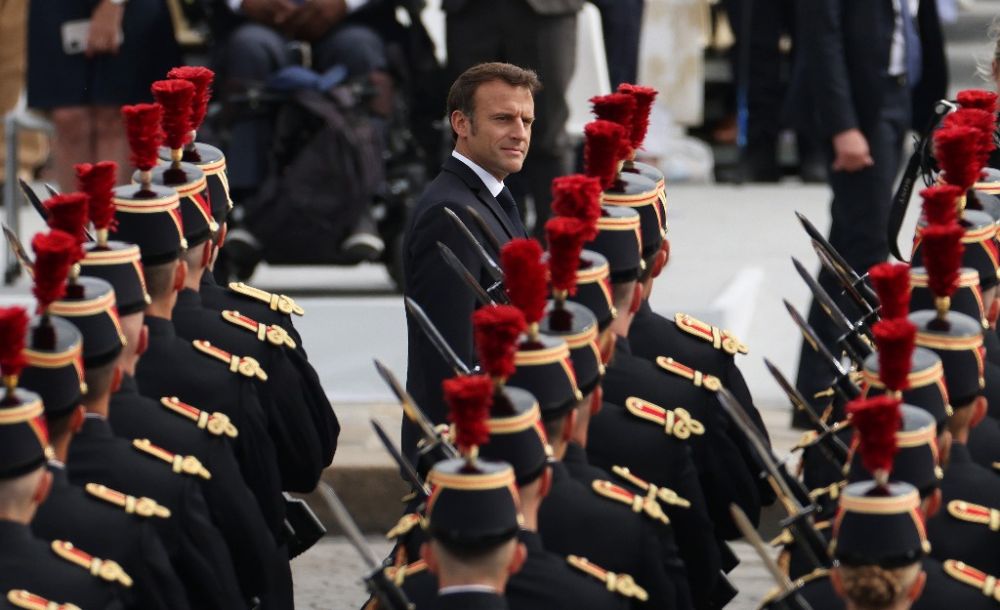 7月14日,法国总统马克龙在巴黎协和广场的国庆阅兵式现场检阅仪仗队。新华社记者高静摄
