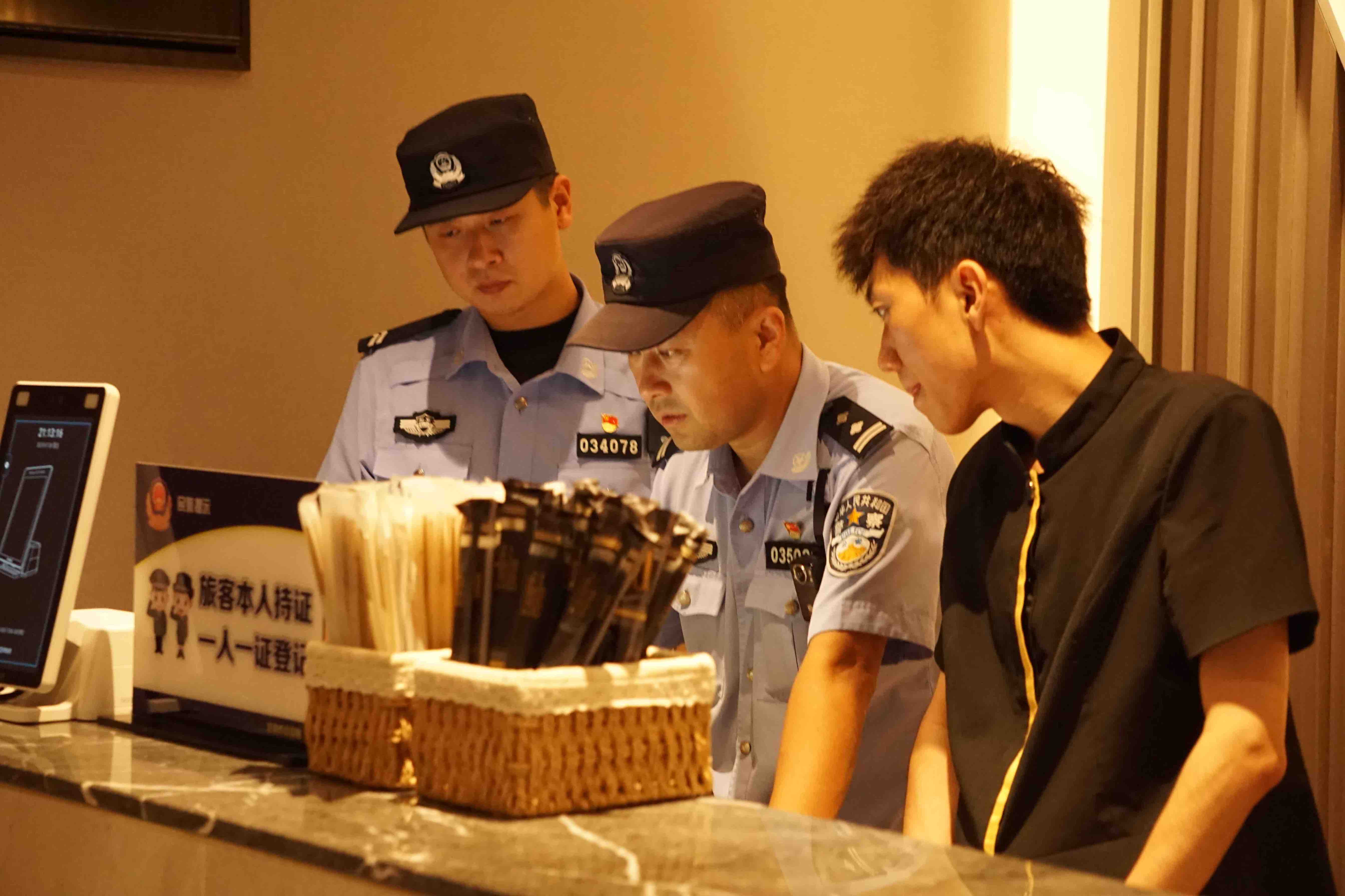 马永旺(中)和同事在辖区酒店开展检查。受访者供图