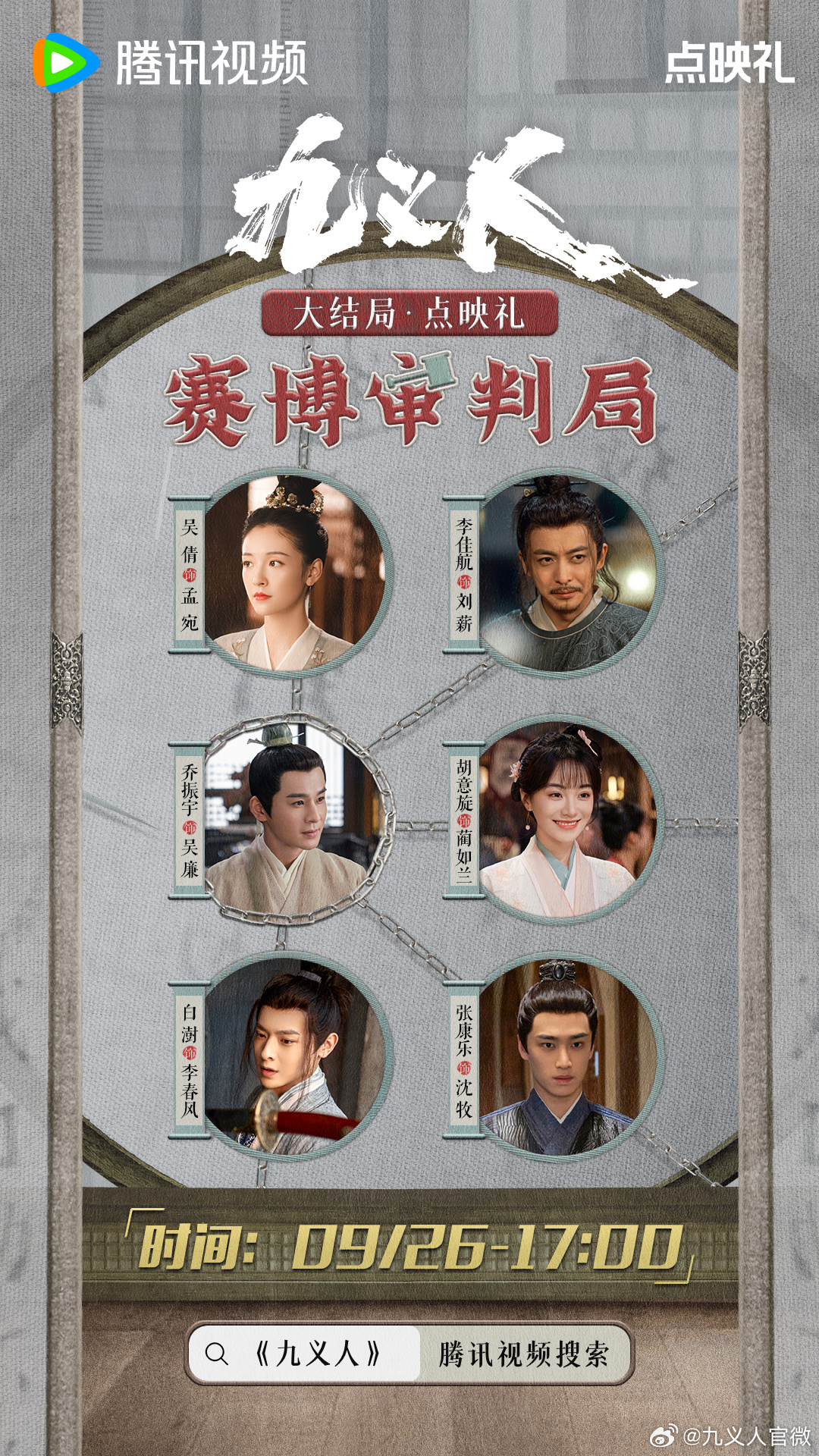 新京报讯 9月26日17:00,电视剧《九义人》即将开启大结局点映礼。官方微博配文称:“晦暗褪去,得见天光。《九义人》赛博审判局即将开启,孟宛(吴倩饰)、刘薪(李佳航 饰)吴廉(乔振宇 饰)、蔺如兰(胡意旋 饰)、李春风(白澍 饰)、沈牧(张康乐 饰)邀诸位一同入局,审判恶人!”