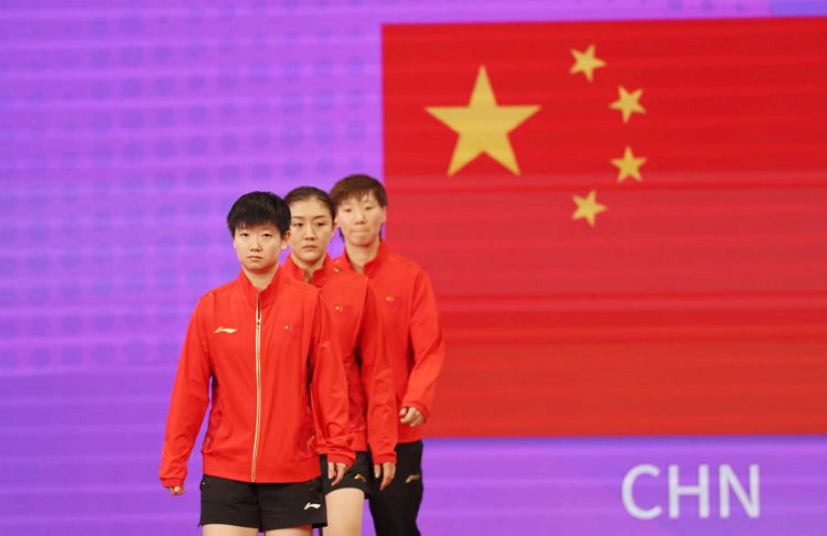 9月26日,杭州第19届亚运会乒乓球女子团体决赛中,中国队3:0战胜日本队,摘得金牌,拿下亚运会五连冠。图为中国队女子团体队员入场。