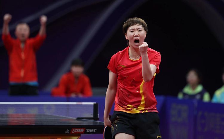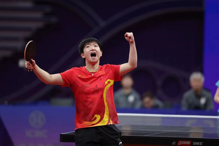 国乒总比分3-0夺冠,王曼昱赛场庆祝。
