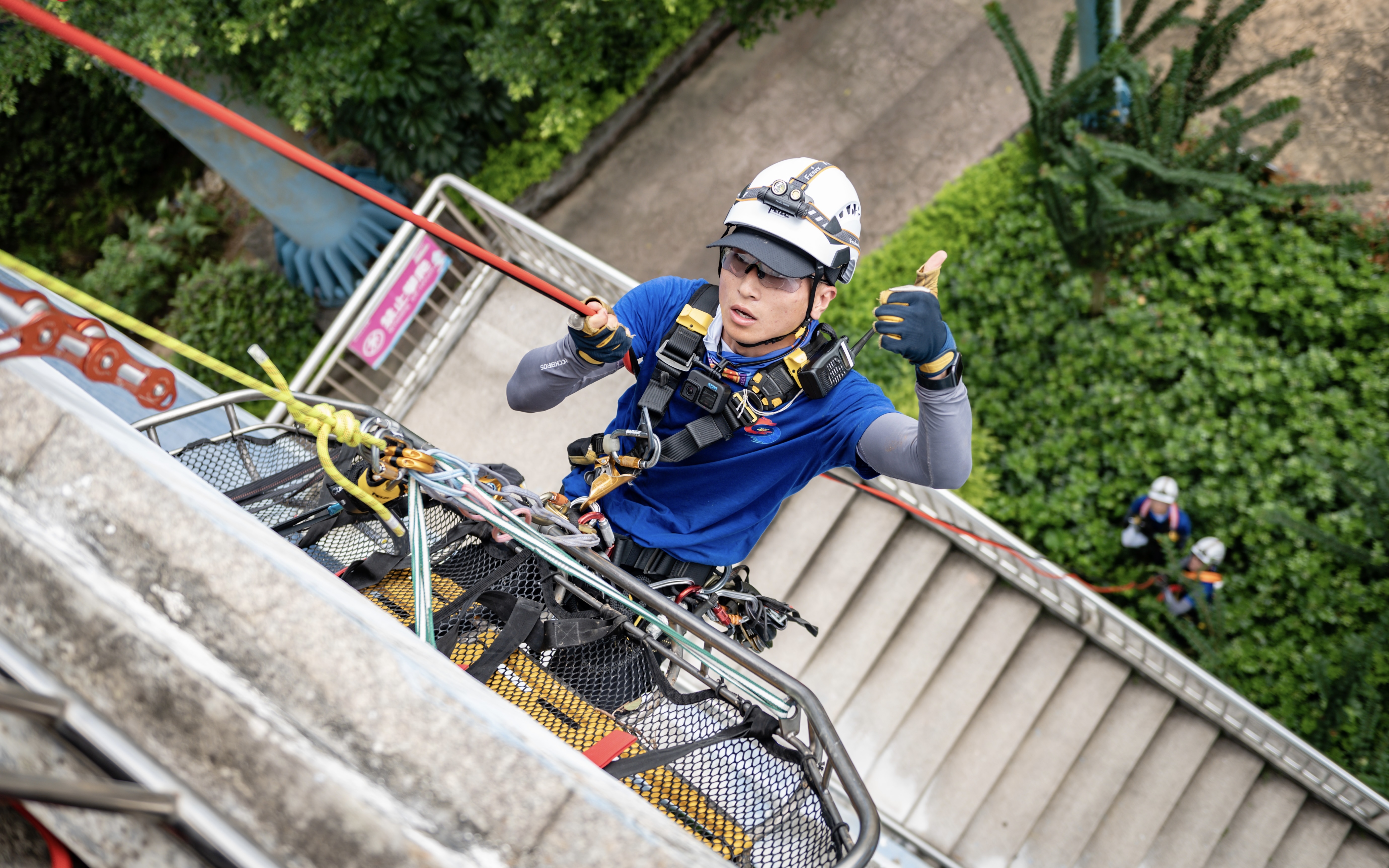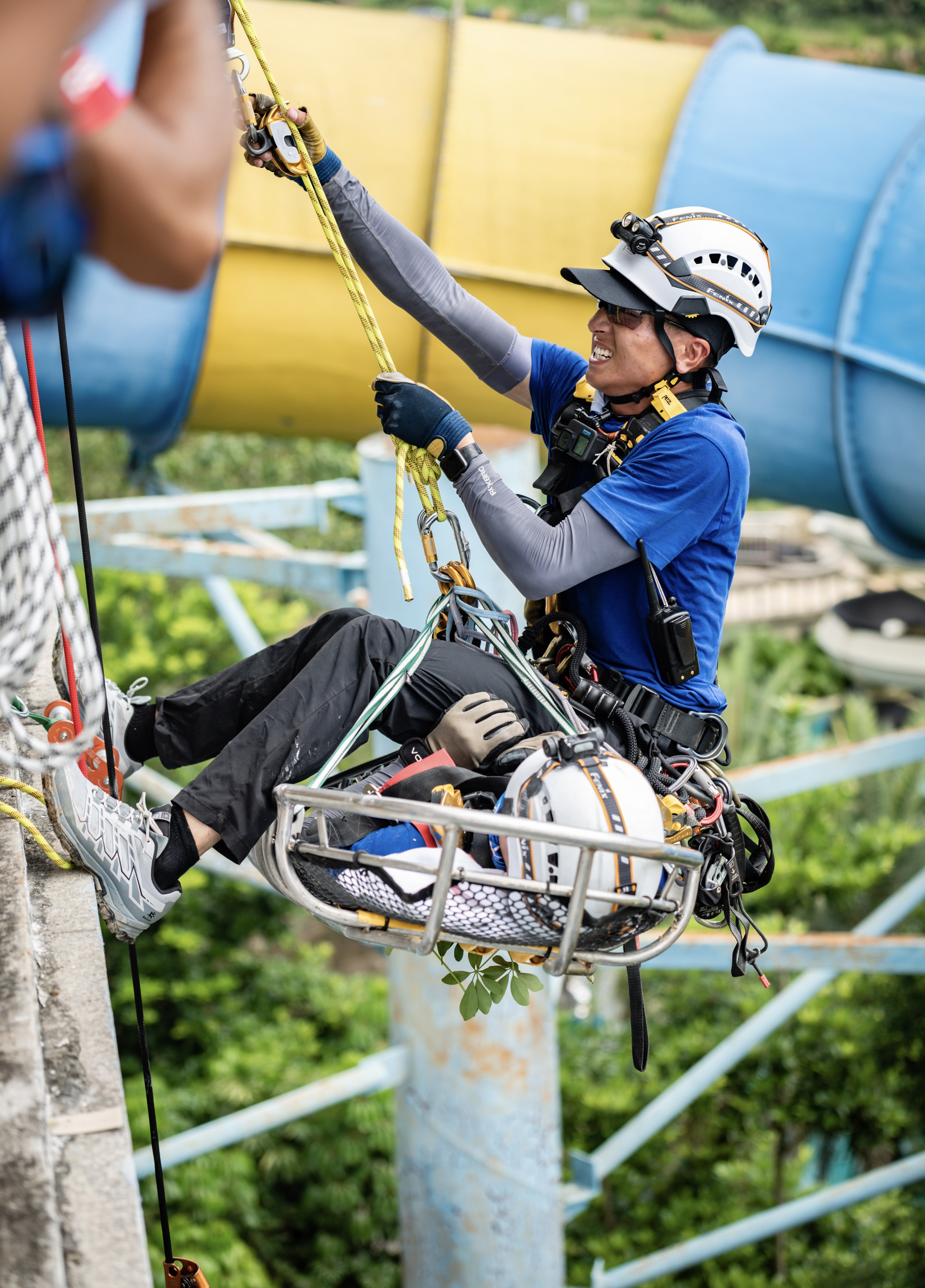 难度最大的课目当属步月登云:队员要在离地面27米的高空作业,操作空间仅有60厘米宽,而且钢架结构障碍物多,极具挑战性。9月的韶关,36℃的高温炙烤着赛场,完成该课目后,队员史作坤大口喘着气,还不时咳嗽几声,“感觉半条命都没了。”取下头盔,他的头发已被汗水浸透,“就像蒸桑拿一样”,从肺到喉咙都有闷热的感觉。“这个项目是一次救援现场的真实还原,能磨炼我们的本领,为以后参与救援任务打牢基础。”史作坤说。