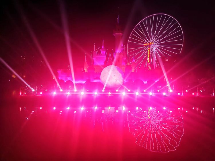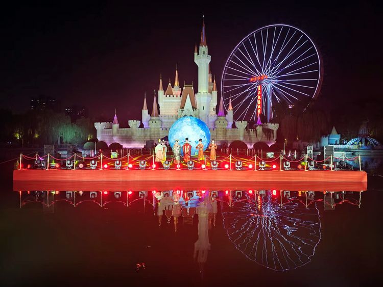 星梦湖水舞台上演中秋、国庆双节灯光秀。