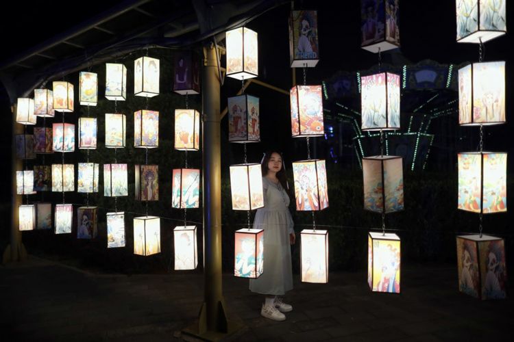 游客在国潮灯笼前留影。