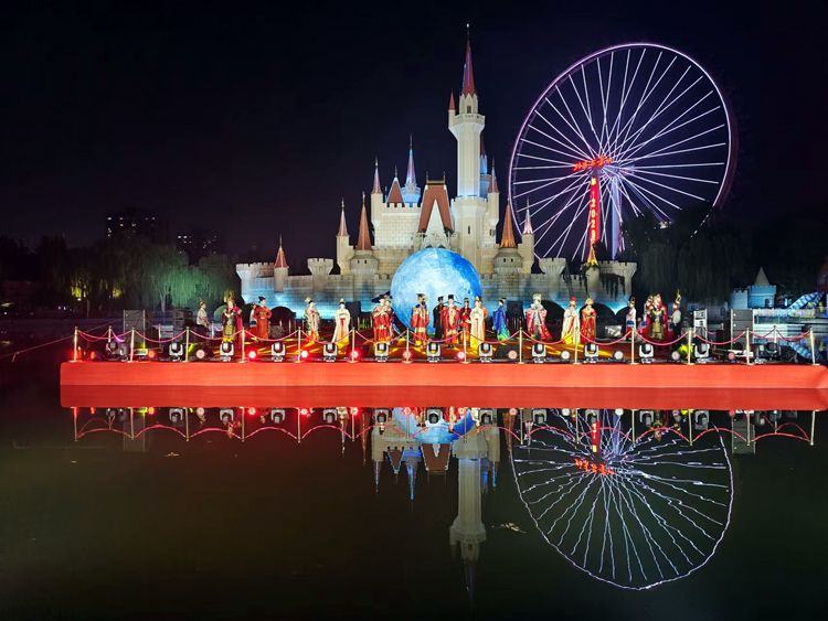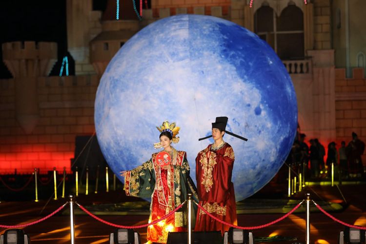 星梦湖水舞台上,演员展示汉唐新婚礼仪。