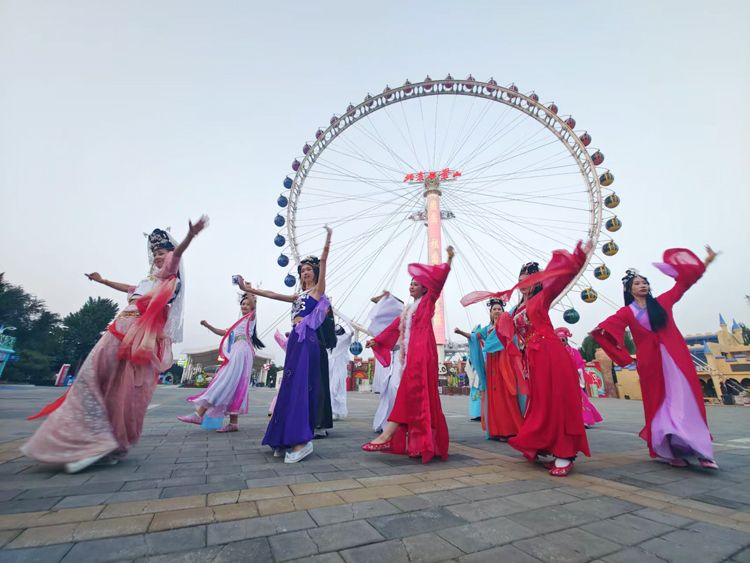 9月26日晚,石景山游乐园,演员表演国风舞蹈。9月29日至10月6日,石景山游乐园将举办2023“国潮艺术荟”活动,每天早9时至22时,园内将举办国潮市集、国潮游戏嘉年华、汉唐新婚礼仪、汉服大秀、国风花车巡游等各类活动。