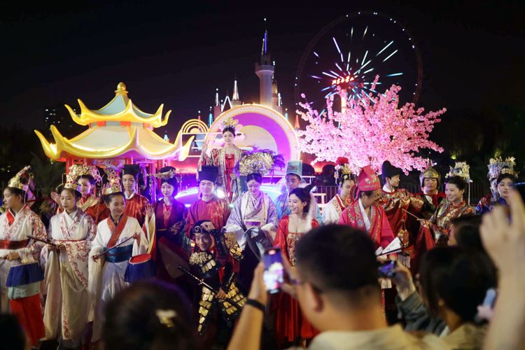 游客围观国风花车巡游。“国潮艺术荟”期间,主题餐厅推出全家欢套餐、皇家转马音乐盒等主题餐品,还有国潮特色小吃、欢啤列车网红小吃和月满中秋团圆月饼DIY活动等。