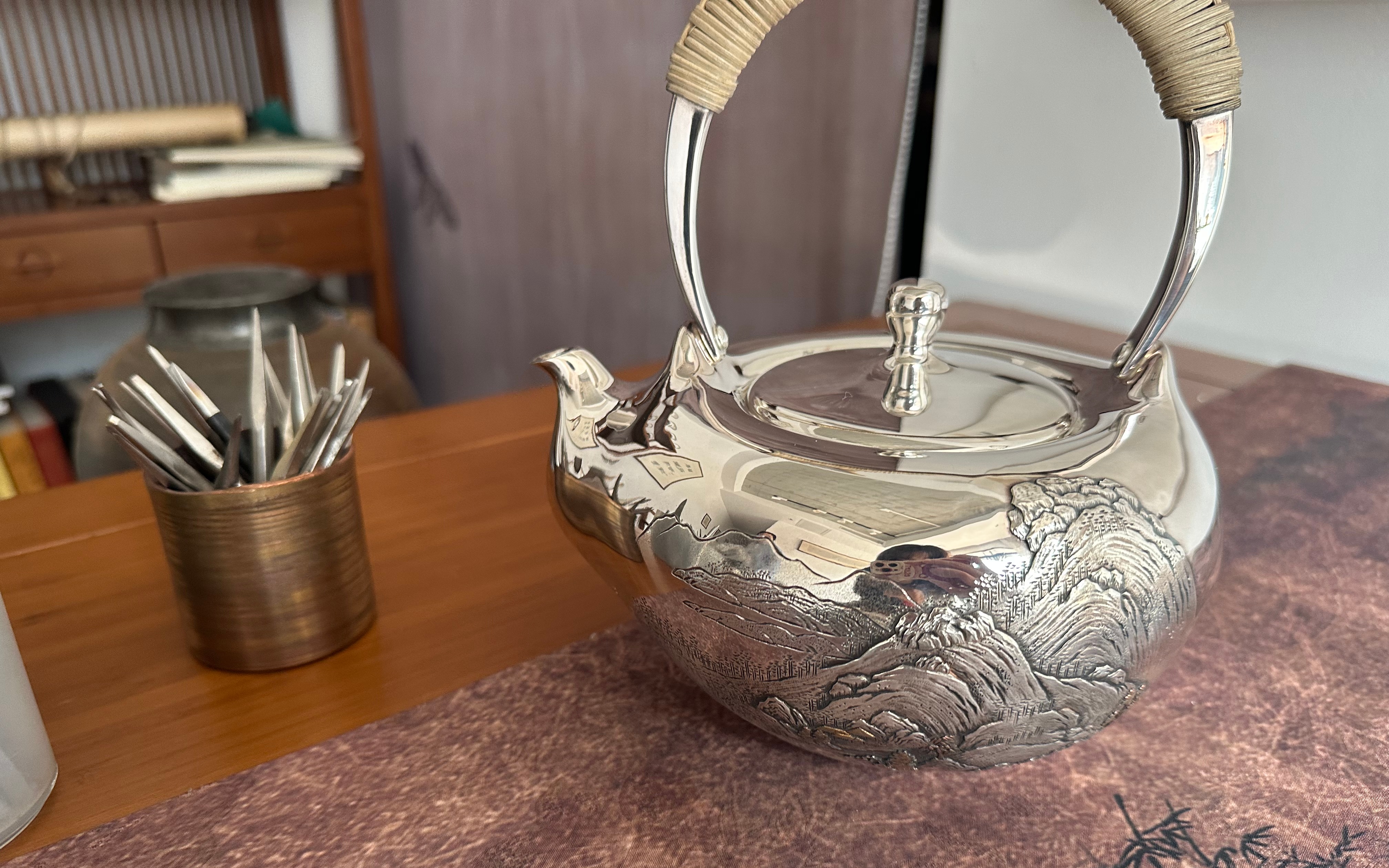 在吉里分会场中区最北端是非遗技艺畲族银器文创展。工作室内展示了包括银茶壶、银杯、银咖啡器具等畲族银器手工制品。作品精湛地雕刻着动植物、生产生活器具、神话故事、抽象图腾等精致纹样,兼具实用性与艺术性。据悉,畲族银器非遗技艺包括化银、打坯、錾刻、焊接等步骤。现场负责人以一件银茶壶作品向我们介绍,上面的图案都是手工錾刻而成。一些铜颜色的部分采用的是黄铜材料,黄颜色部分则采用黄金材料;部分以中国古代错金银工艺制作而成。2023北京国际设计周活动期间,观众可以亲自到店参与非遗文创产品的设计和制作,感受畲族银器巧夺天工的制作过程。