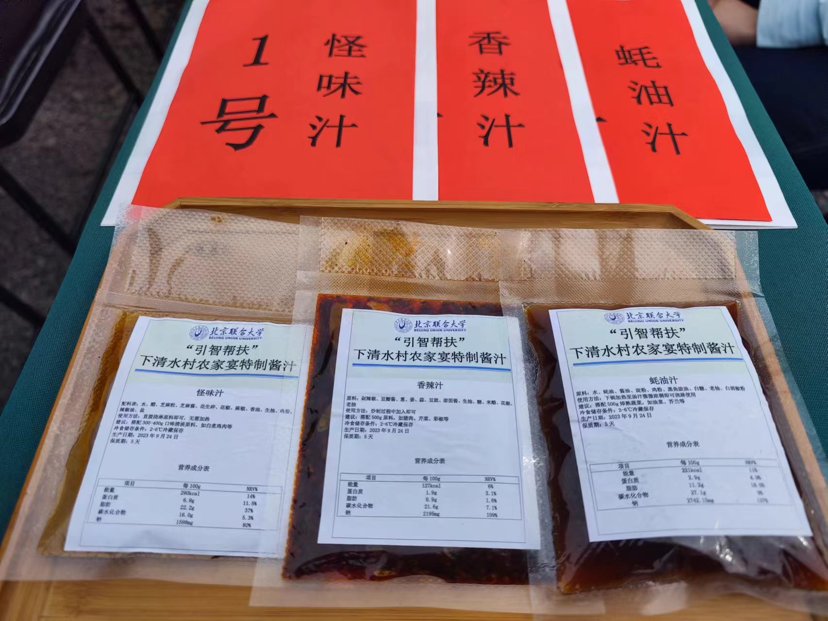 活动现场还发布了北京联合大学帮助研发设计的“农家宴特制酱汁”。据介绍,这款特制酱汁选择天然的新鲜的原材料,没有任何人工添加剂,根据不同原料的特点和配方的要求,精确控制比例,有怪味、香辣、蚝油三种口味。后续,下清水村计划推动酱汁生产产业落地,从而带动村民就业。