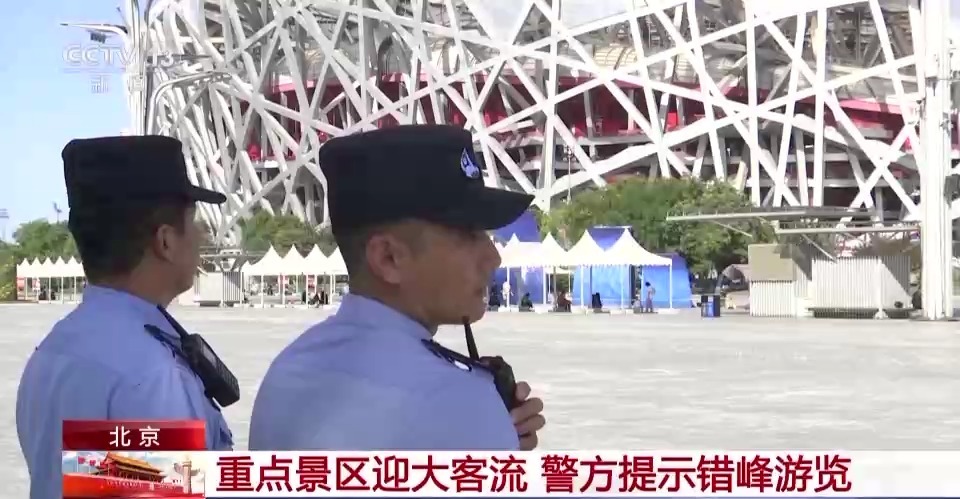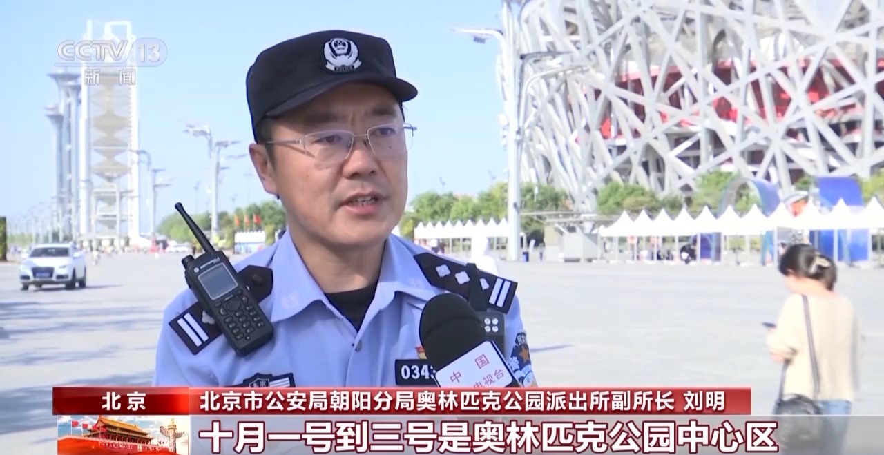 北京市公安局朝阳分局奥林匹克公园派出所副所长 刘明:十月一日到三日是奥林匹克公园中心区游览的高峰期,今年的情况十月二日会达到一个游览的顶峰,我们建议有条件的话请您错峰出游。同时警方提醒您,如果您在旅游的过程中,遇到非法一日游、强买强卖、黄牛倒票等欺诈行为,请及时向警方进行举报。