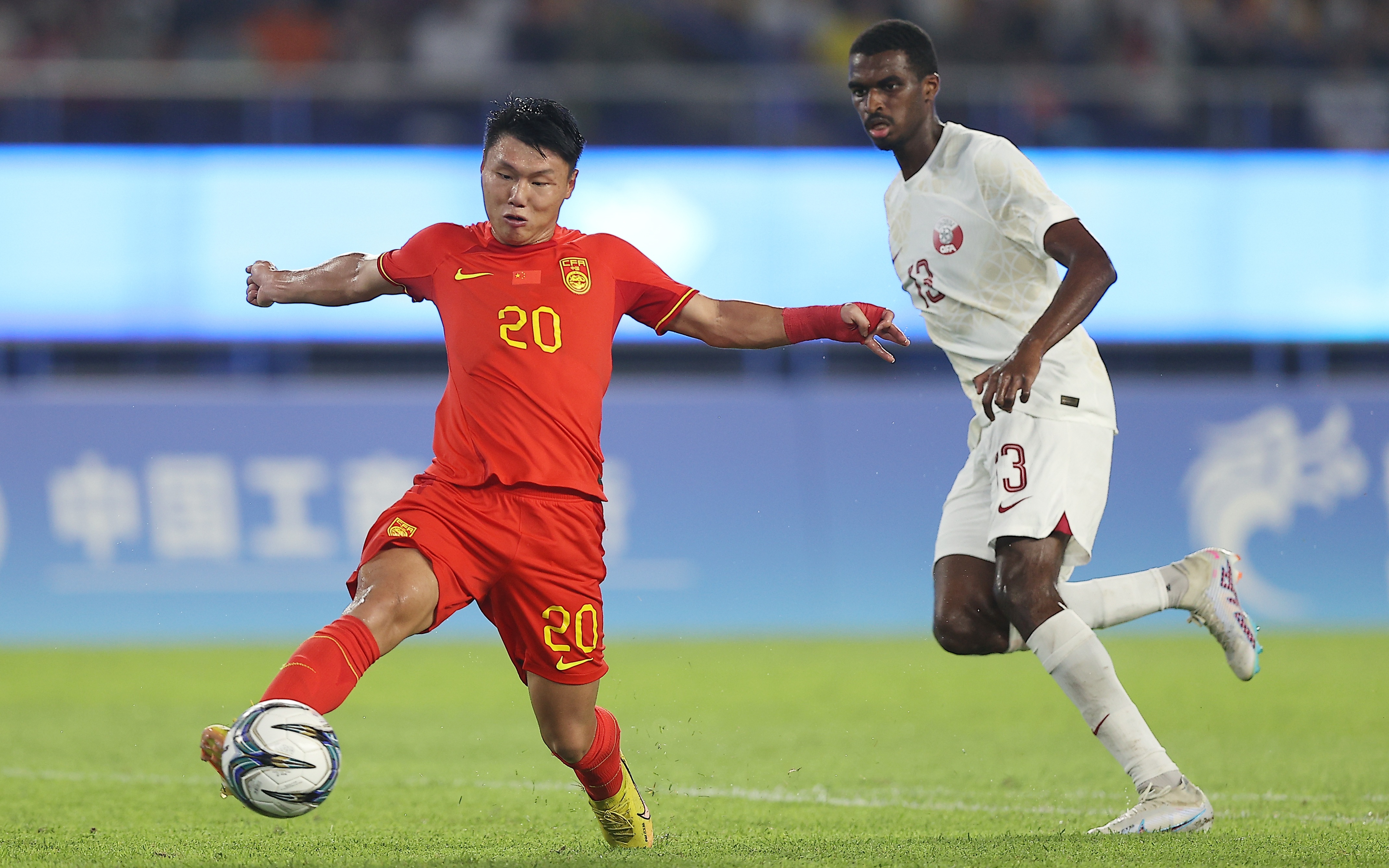 方昊(左)在与卡塔尔之战中拼抢。今晚战韩国队,中国队需要更多人站出来。 杭州亚组委供图