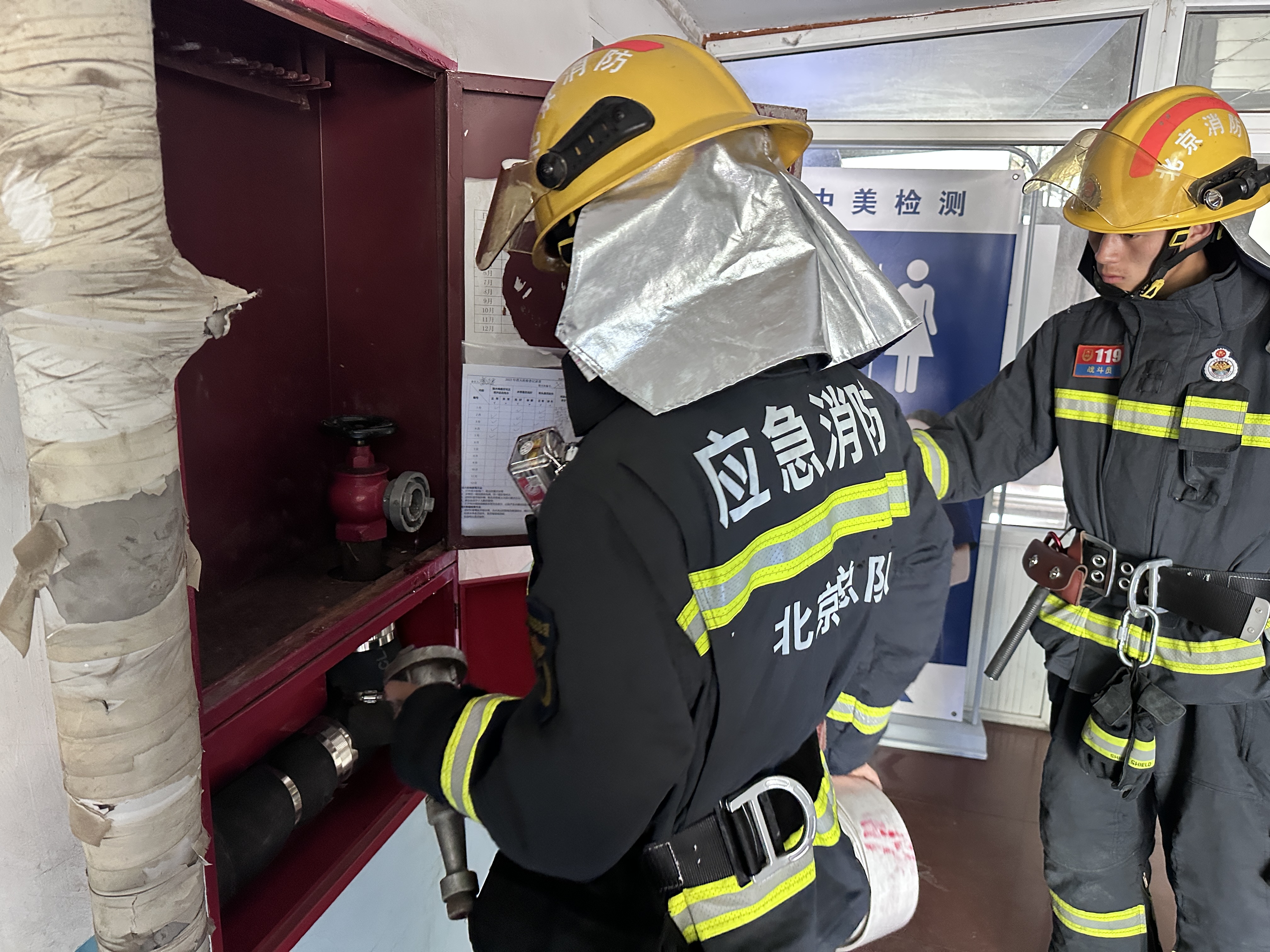 消防指战员检查消防设施。图源:朝阳区消防救援支队
