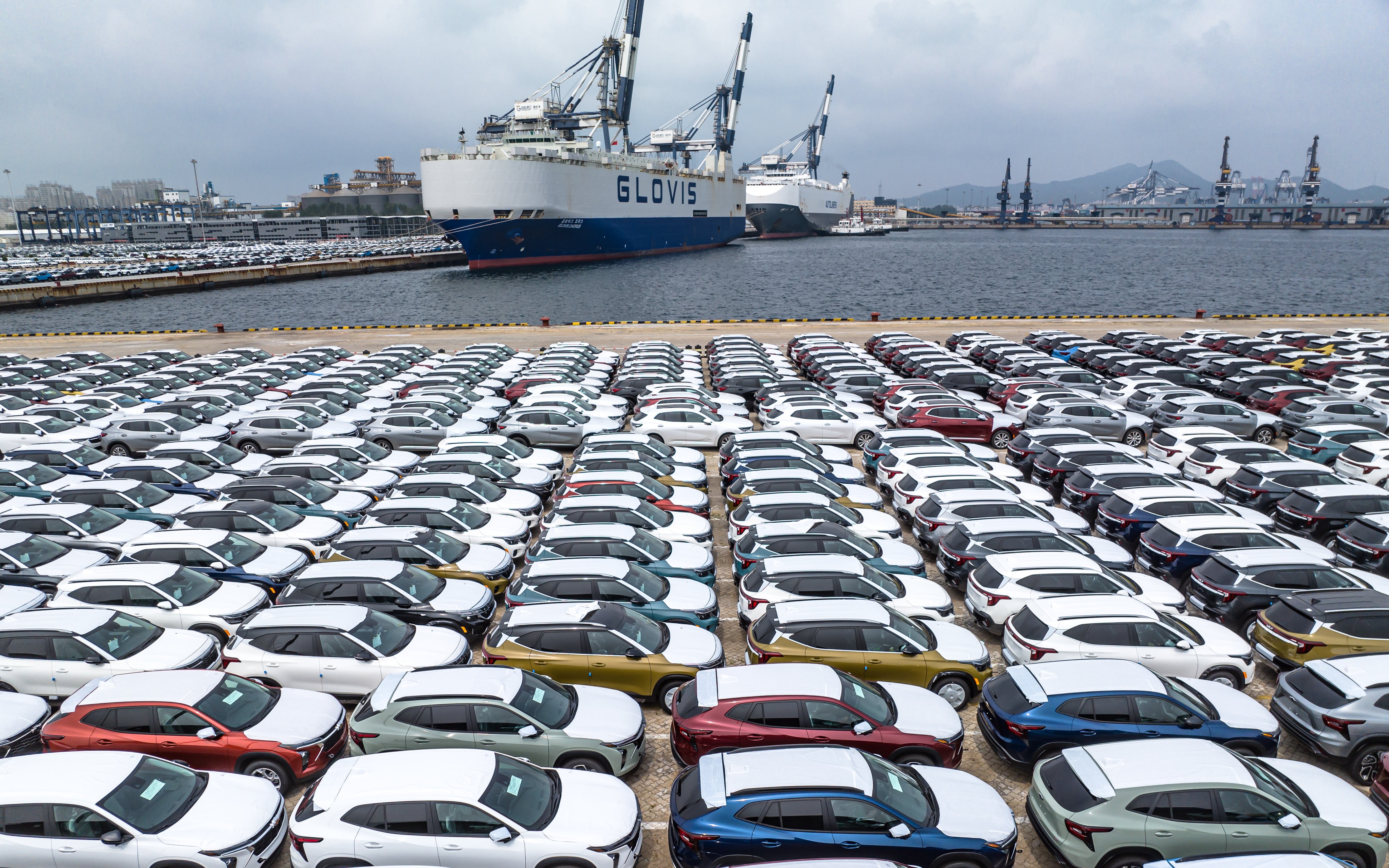 ▲9月12日,在山东港口烟台港汽车码头,大批出口商品车等待装船发运(无人机照片)。图/新华社