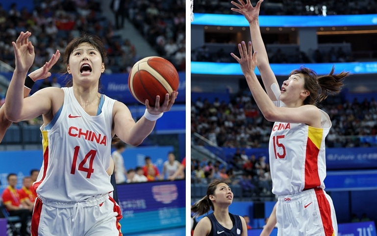 中国女篮两大内线李月汝(左)和韩旭均有出色发挥。 新京报记者 王贵彬 摄