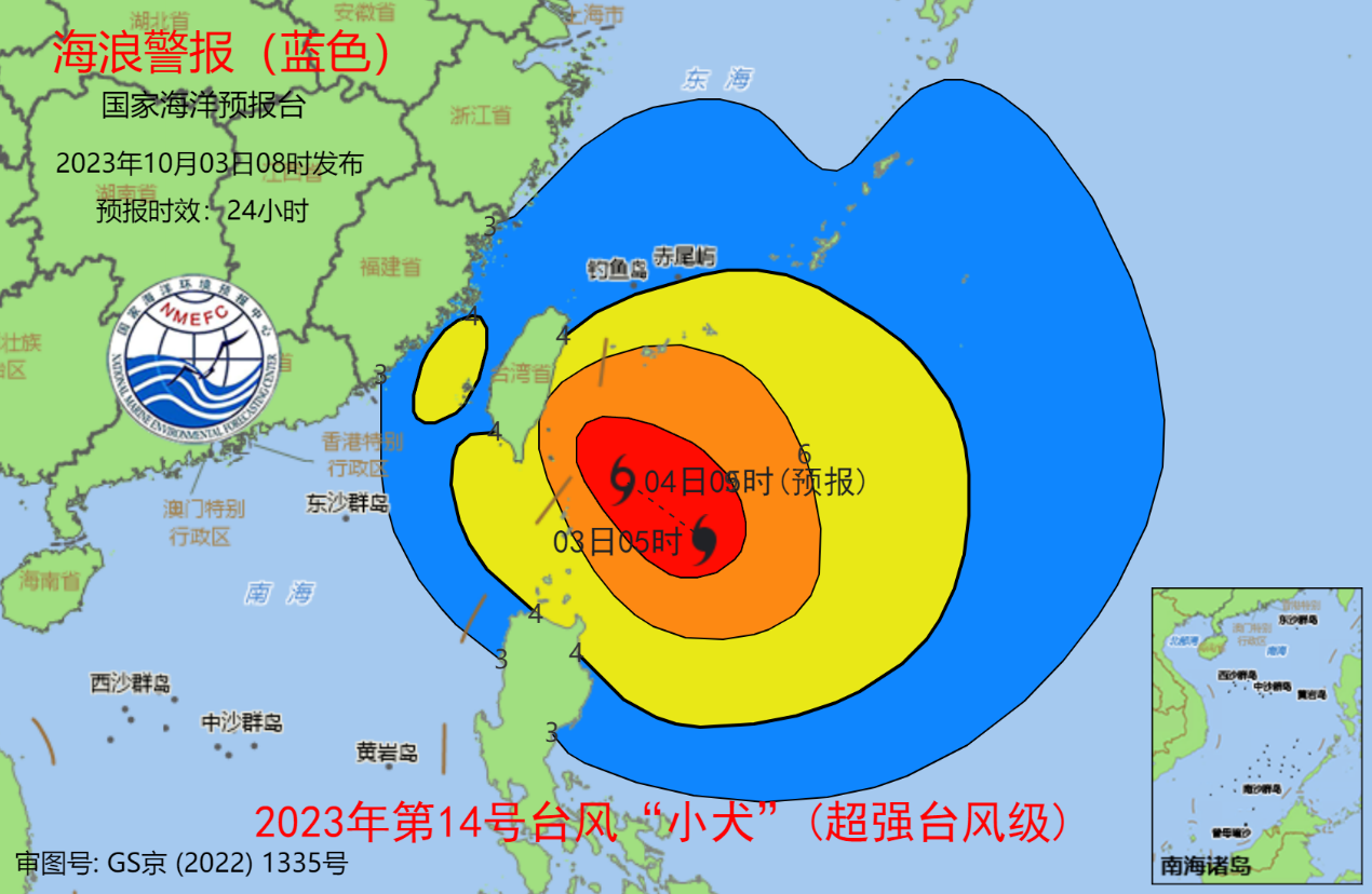 受今年第14号台风“小犬”(超强台风级)和冷空气的共同影响,预计10月3日下午到4日中午,东海南部、台湾海峡将出现3.5到5米的大浪到巨浪区;福建、浙江南部近岸海域将出现2到3.3米的中浪到大浪,近岸海域海浪预警级别为蓝色。