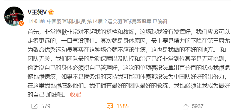 无缘羽毛球男双八强,王昶发文道歉获搭档回应