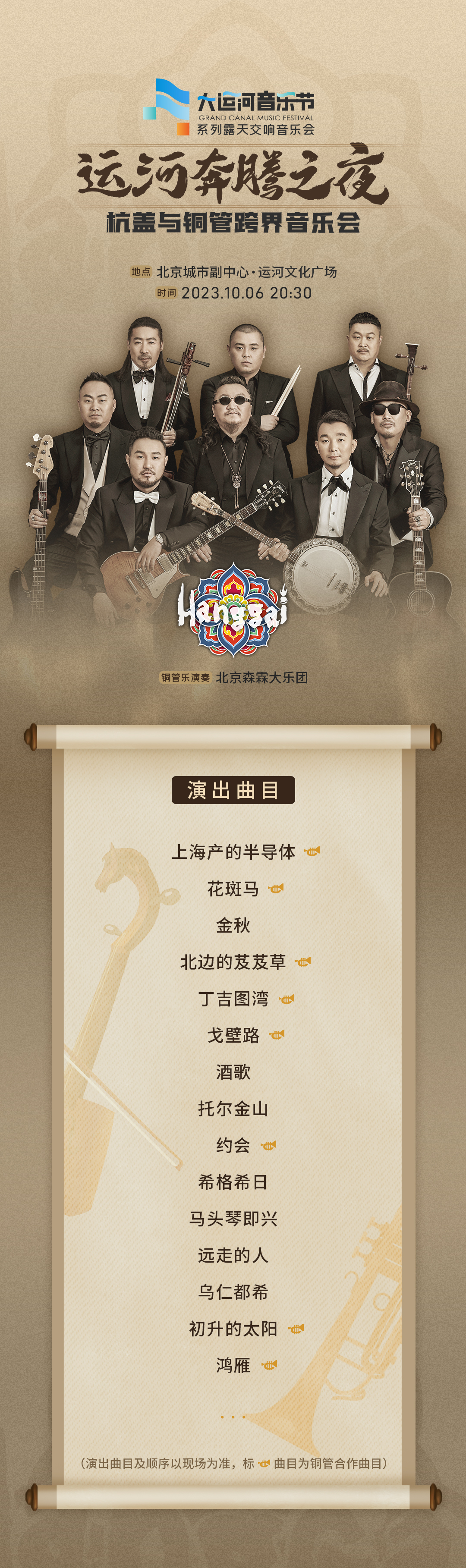 首日开幕演出之后,著名摇滚乐队杭盖将带来热血澎湃的《运河奔腾之夜——杭盖与铜管跨界音乐会》。杭盖乐队将在国内首次以双马头琴与7人铜管大乐团的顶配阵容,共同演绎民族摇滚与现代管乐的跨界和鸣。