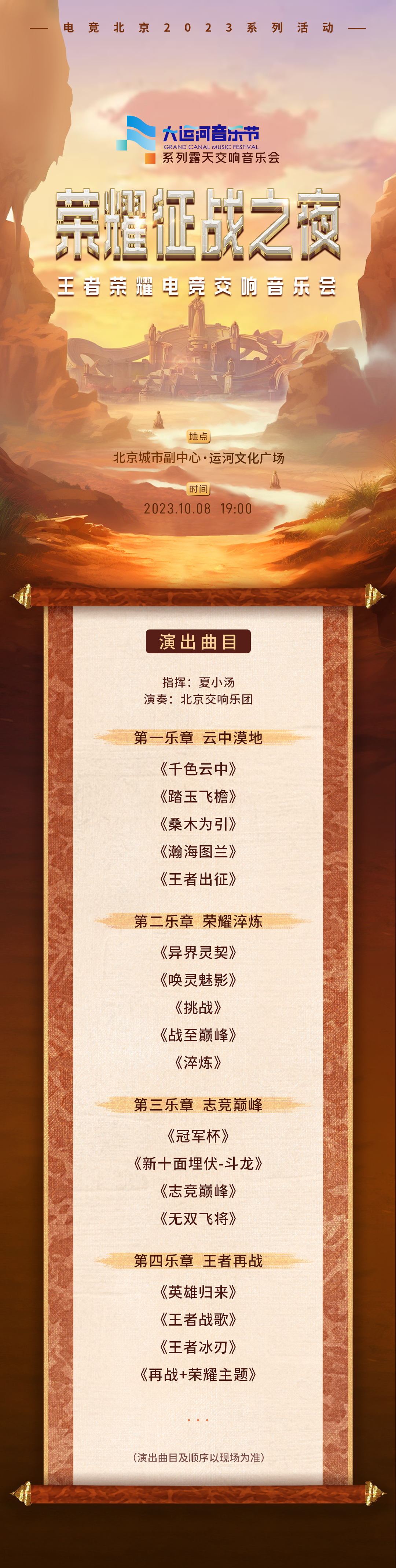 而在杭州亚运会闭幕式的同时,首届大运河音乐节的闭幕演出将由北京交响乐团带来英雄豪迈的《荣耀征战之夜——王者荣耀电竞交响音乐会》,这也是顶流手游王者荣耀本年度在北京的唯一一场正版授权音乐会,作为“电竞北京2023系列活动”之一,让您不必去杭州亚运会电竞赛场,就能听到电竞音乐的恢弘乐章。