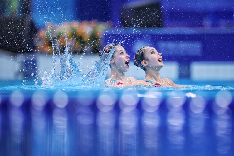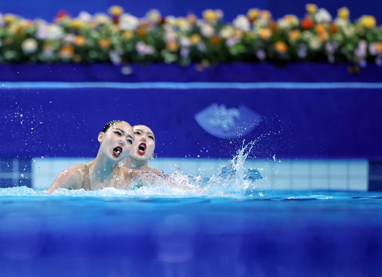 朝鲜队选手在花样游泳双人技术自选比赛中。