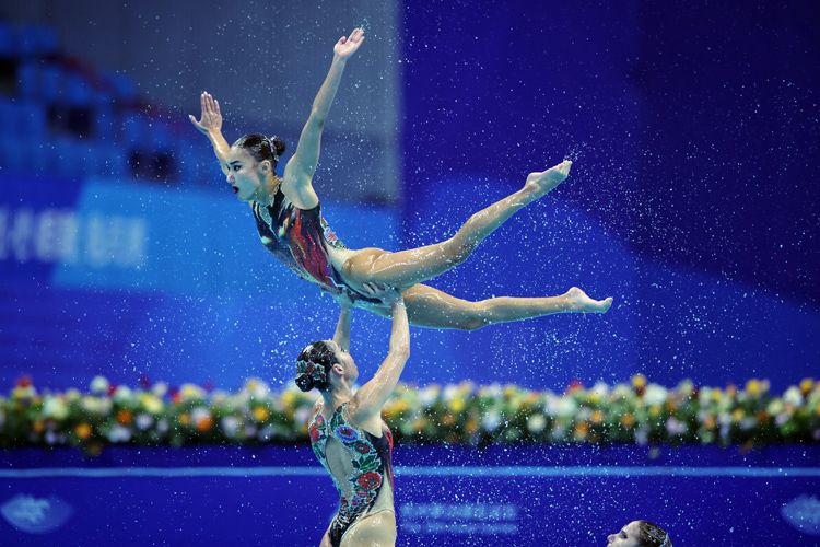 哈萨克斯坦队选手在花样游泳集体技巧自选比赛中。