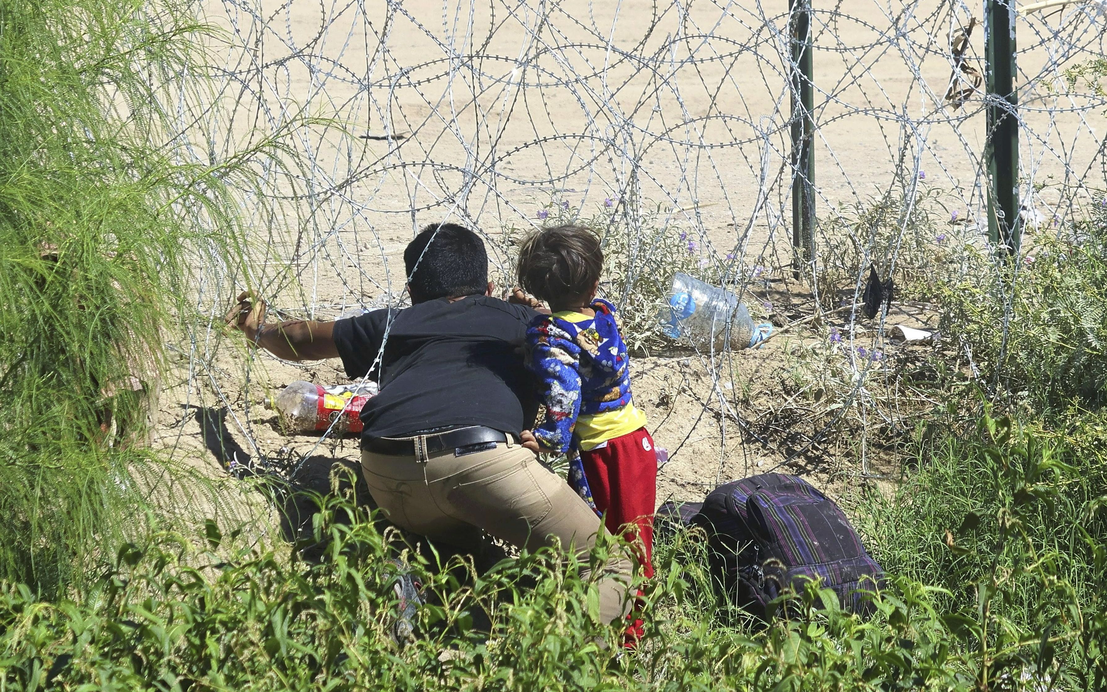 当地时间2023年9月29日,美国埃尔帕索,一名带着孩子的男子拿着刀片穿过铁丝网,边境警卫将他拦住。图/视觉中国