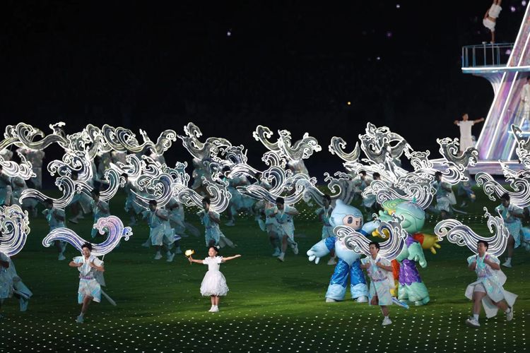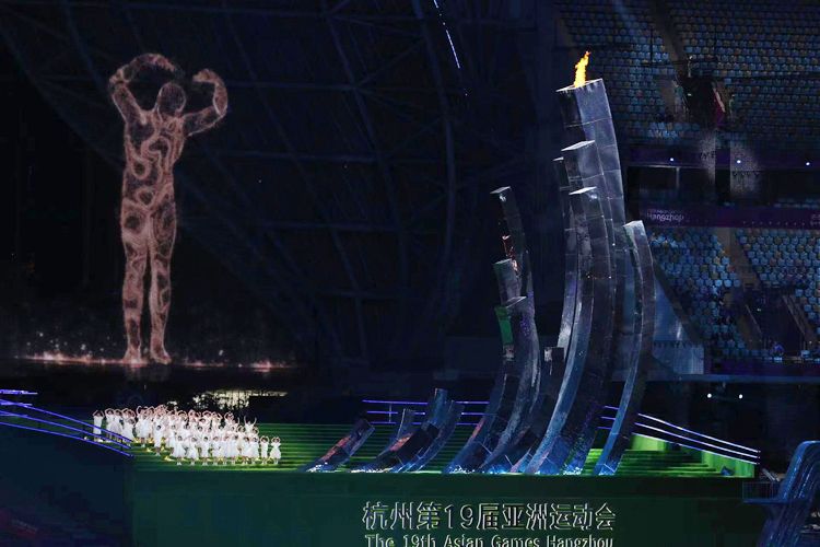 “数字火炬人”和现场所有观众、演员共同见证亚运会火炬塔熄灭。