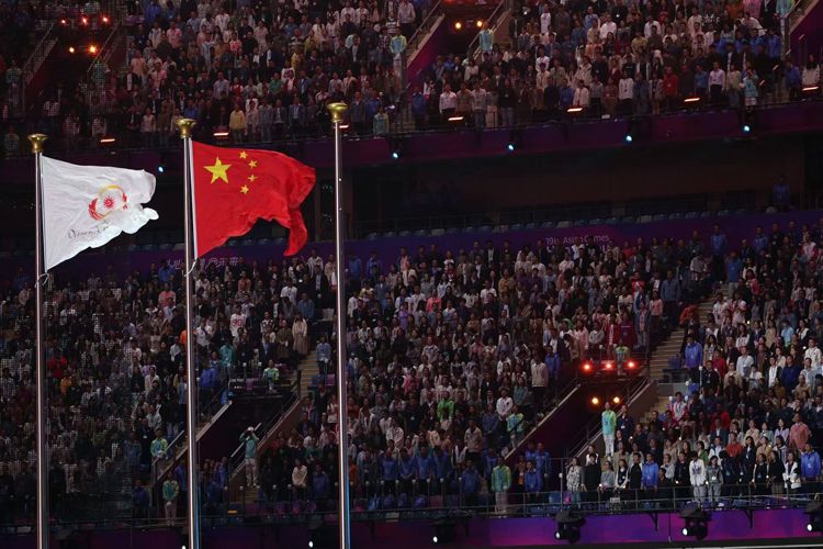 10月8日,杭州第19届亚洲运动会闭幕式在杭州奥体中心体育场举行。图为中华人民共和国国旗在闭幕式上升起。