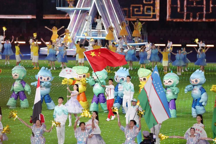 中国代表团旗手谢震业在杭州亚运会闭幕式上入场。