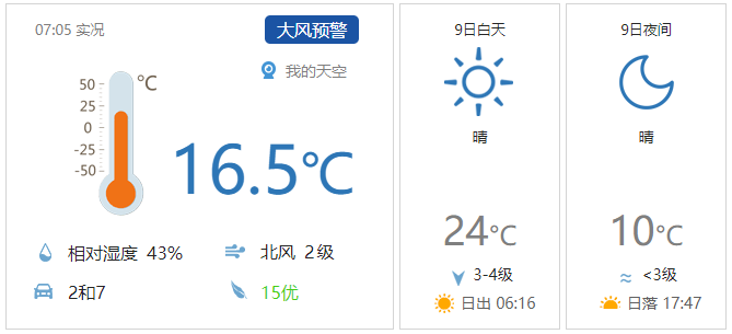 今天白天晴间多云,北风三四级(阵风六七级)转二级,最高气温24℃;夜间晴间多云,北风一二级,最低气温10℃。