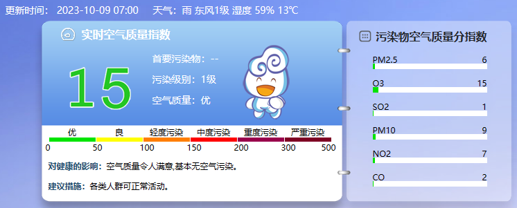 据北京市生态环境监测中心今早7时数据,目前实时空气质量指数15,污染级别1级,空气质量优。