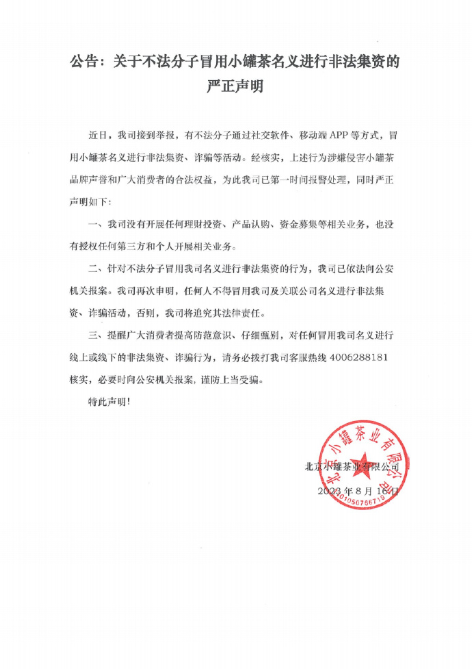 小罐茶发布的声明显示,该公司接到举报,有不法分子通过社交软件、移动端App(应用软件)等方式,冒用小罐茶名义进行非法集资、诈骗等活动。上述行为涉嫌侵害小罐茶品牌声誉和消费者合法权益,为此小罐茶已向公安机关报案。小罐茶强调,任何人不得冒用小罐茶及关联公司名义进行非法集资、诈骗活动,否则将追究其法律责任。