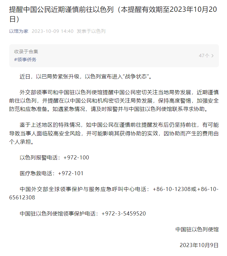 外交部领事司和中国驻以色列使馆提醒中国公民密切关注当地局势发展,近期谨慎前往以色列,并提醒在以中国公民和机构密切关注局势发展,保持高度警惕,加强安全防范和应急准备。如遇紧急情况,请及时报警并与中国驻以色列使馆联系寻求协助。