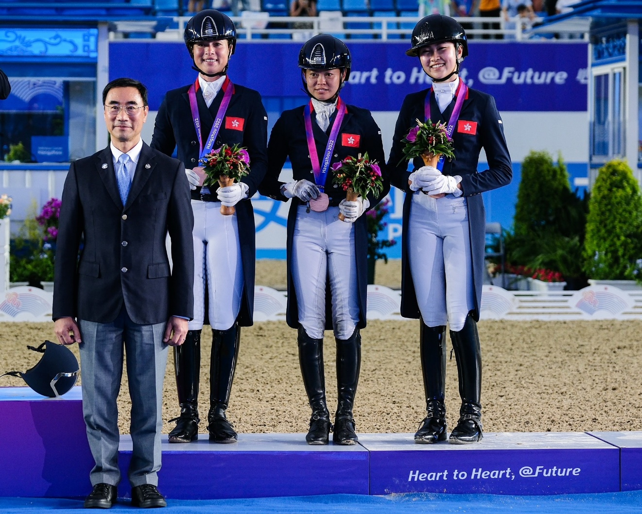 9月26日,香港赛马会主席兼中国香港马术总会会长利子厚(左一)出席杭州亚运会马术项目盛装舞步团体赛颁奖典礼。 香港赛马会供图