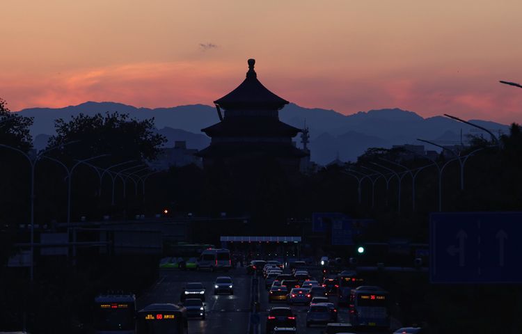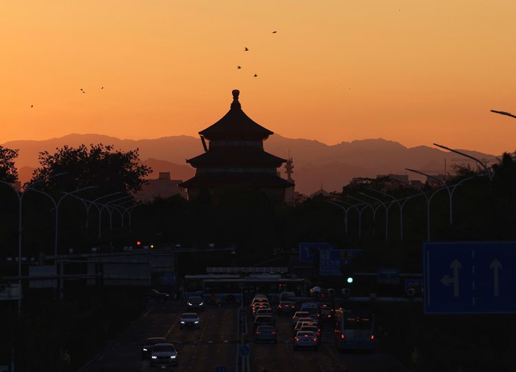 10月9日,体育馆路,太阳即将下山,夕阳将祈年殿的远山背景染成橙色。