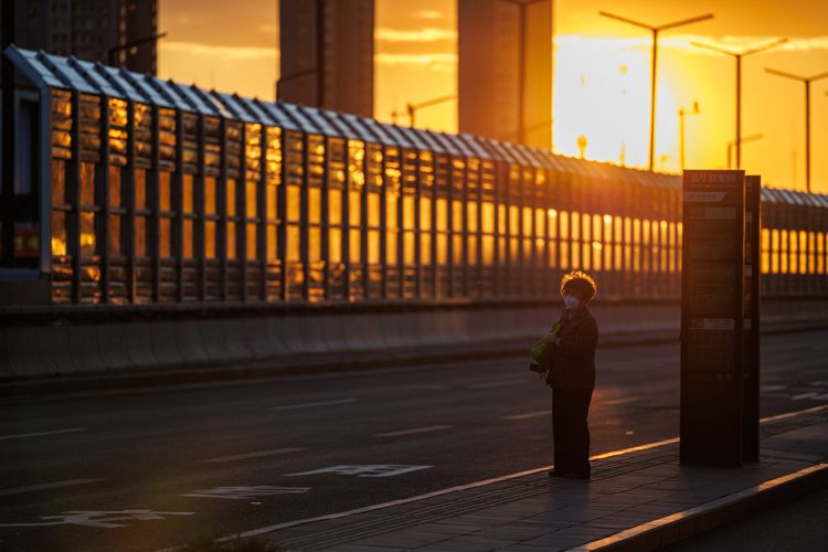 10月9日,北京通朝大街,市民在夕阳里等待公交车。