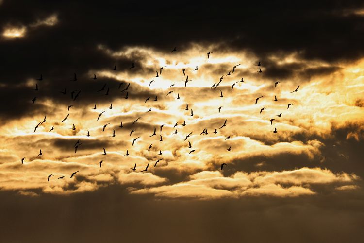 10月9日,东四十条,归巢的鸽群穿过金色的晚霞。